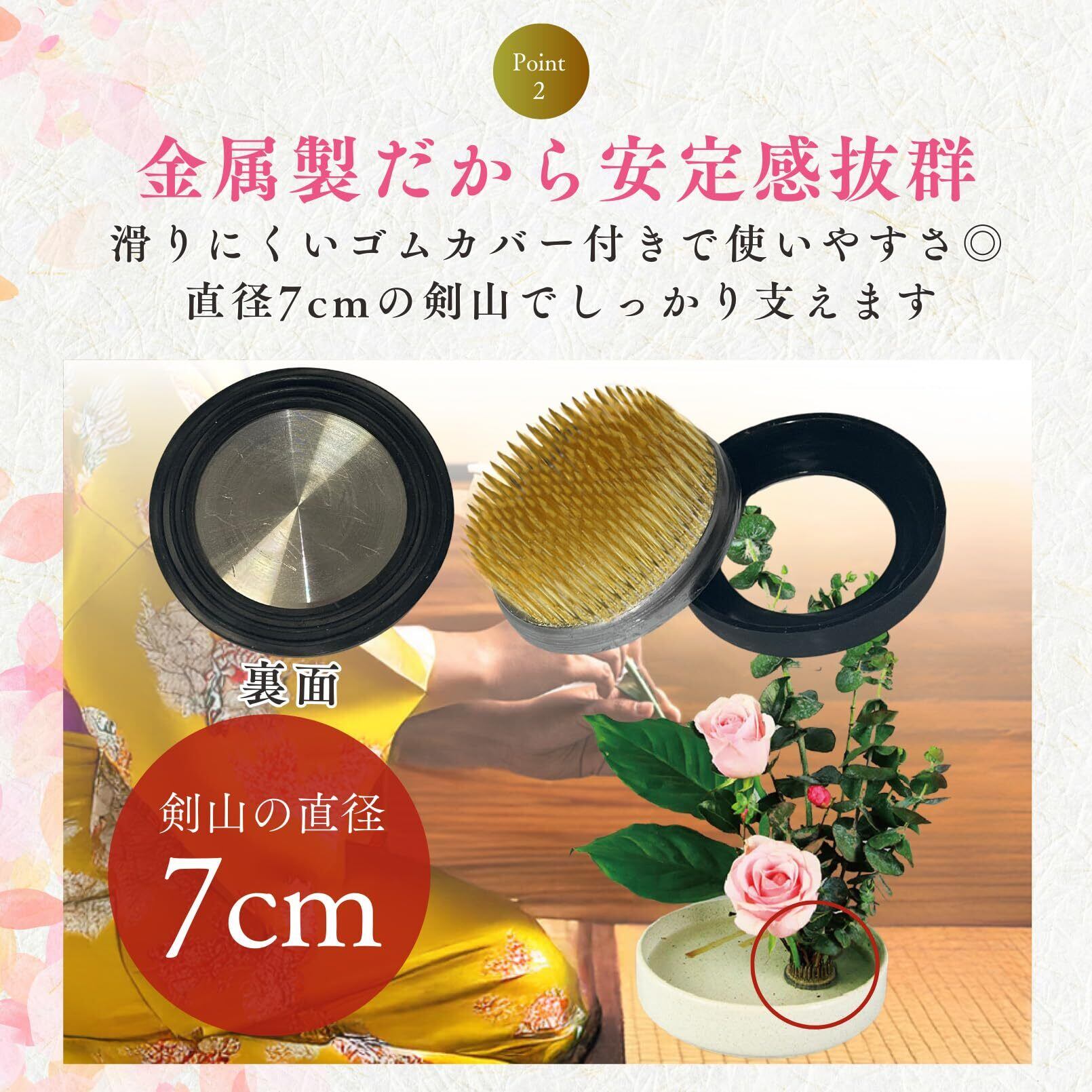 【安心・便利な剣山機能】 直径7cmの丸型剣山はゴムリング付きで、花器を傷つけず滑り止め効果も抜群です。鋭い針が花材をしっかりと固定し、思い通りの角度で花を生けることができます。剣山とゴムリングは取り外し可能で、お手入れも簡単。安全性と使いやすさを兼ね備えた設計で、初めての方でも安心してご使用いただけます。花材の自由な表現を可能にする頼れるパートナーです。