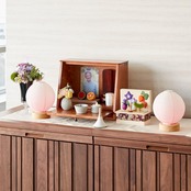 お盆飾りの「牛馬」や「提灯」をちりめんで表現した、はせがわオリジナルの商品です。ほおずきと桔梗の押絵が施された桐箱と、箱の中に納められている敷物・牛馬・提灯・蓮の花を飾ってお盆を演出ください。両手に乗るサイズでどこにでも飾れる手軽さを感じられます。