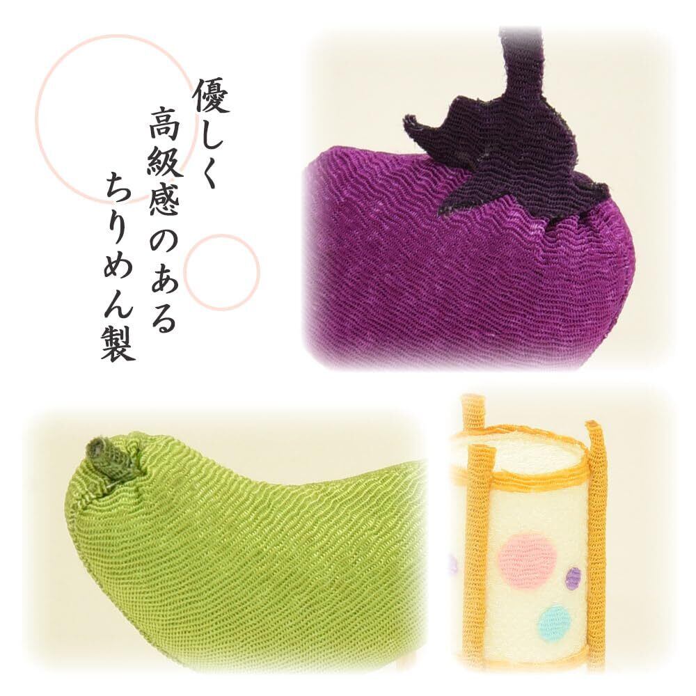 旧来はきゅうりを馬、なすを牛に見立てて割りばしなどで足を作って飾っていましたが、夏場の暑さで果物や野菜が傷んでしまう、毎年使用できるものがあったらいいのに、といったご要望に応え、ちりめん製の商品をご用意しました。