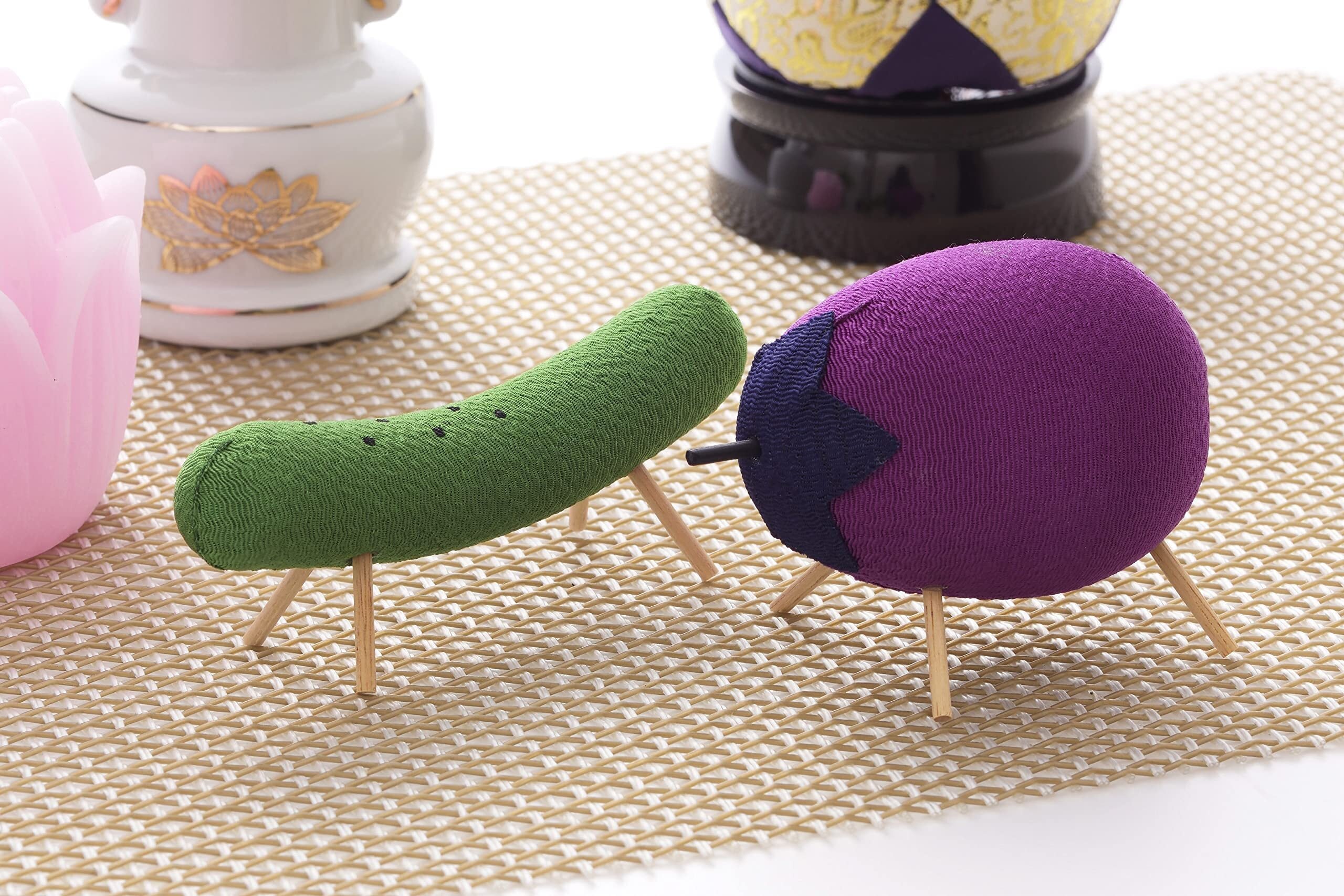 手軽・かわいい・おしゃれな盆飾りです。先祖の霊の乗り物として。迎え盆「きゅうり」足の速い馬。送り盆「なす」は足が遅い牛。ひとつひとつ真心こめて手づくりで作られています。