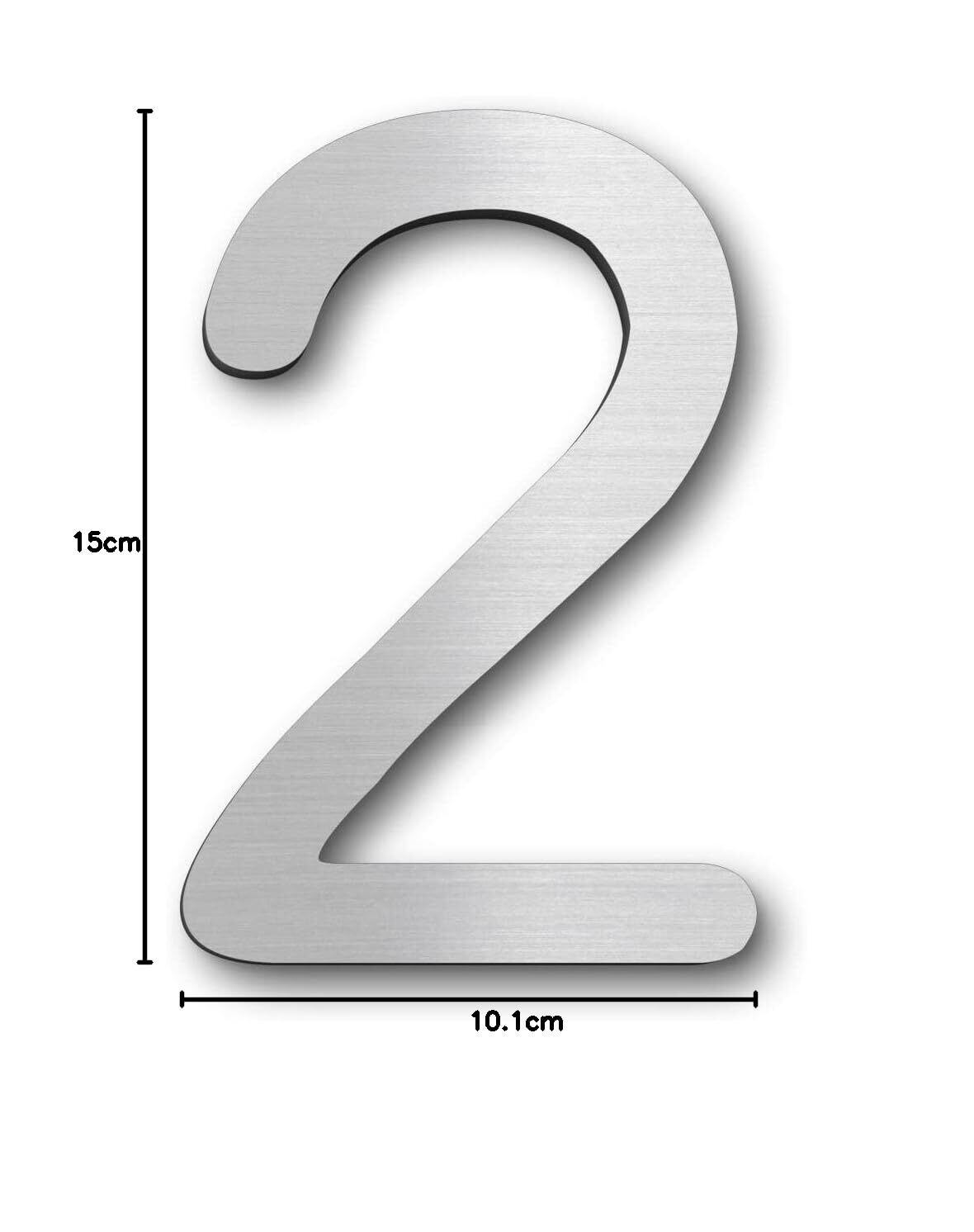 【サイズ】縦15cm×横10.1cm×厚さ2mm (「2」が1枚入り) 【材質】2層アクリル材+両面テープ(日本製)【カラー】シルバー ステンレス調ヘアライン仕上げ)【詳細】アクリル製で軽くて丈夫、サビなくていつまでもキレイです。 テープ付きで簡単に貼れます。 平らな面への取り付けは、貼り付けるだけです。