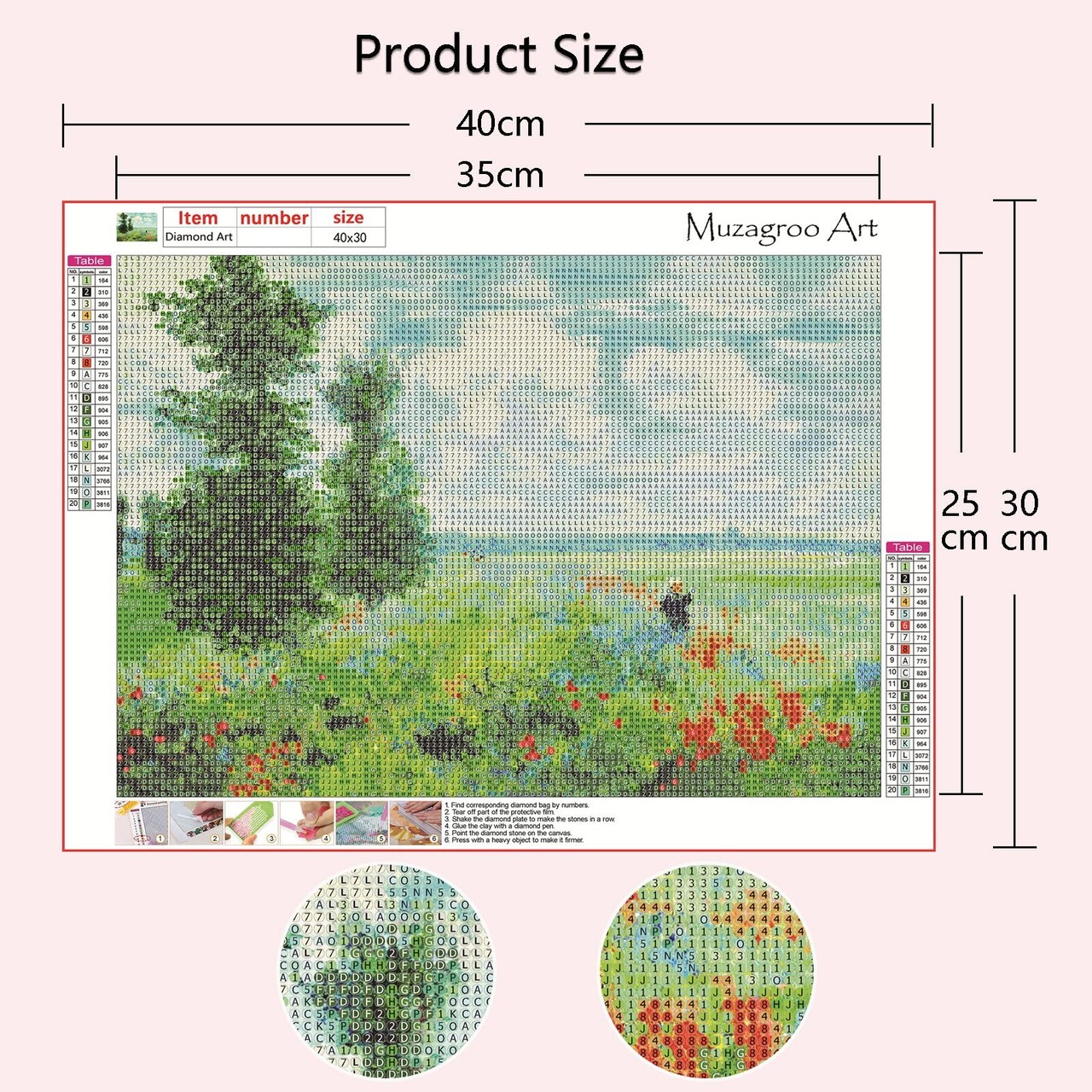 ラウンドダイヤモンドフルドリル--サイズ:30x40cm(11.8x15.7インチ)。 29個のファセットラウンドダイヤモンド、キャンバス、シンボル、文字へのHD印刷は非常に見やすく、読みやすく、初心者でも印刷部分は接着され、絵はフィルムで保護されています。