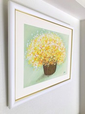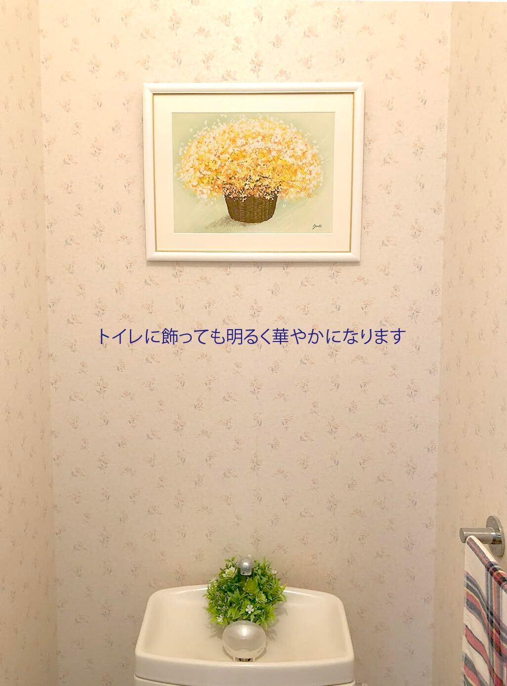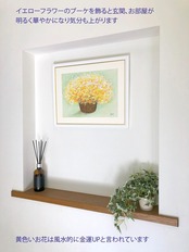 風水運気の中で玄関の黄色は幸福と考えられています。イエローは夢の実現や希望や変化そして金運のパワーを象徴します。繊細に描かれたブーケの鮮やかな色調がお部屋を明るく彩り元気が湧いてくる感じです。