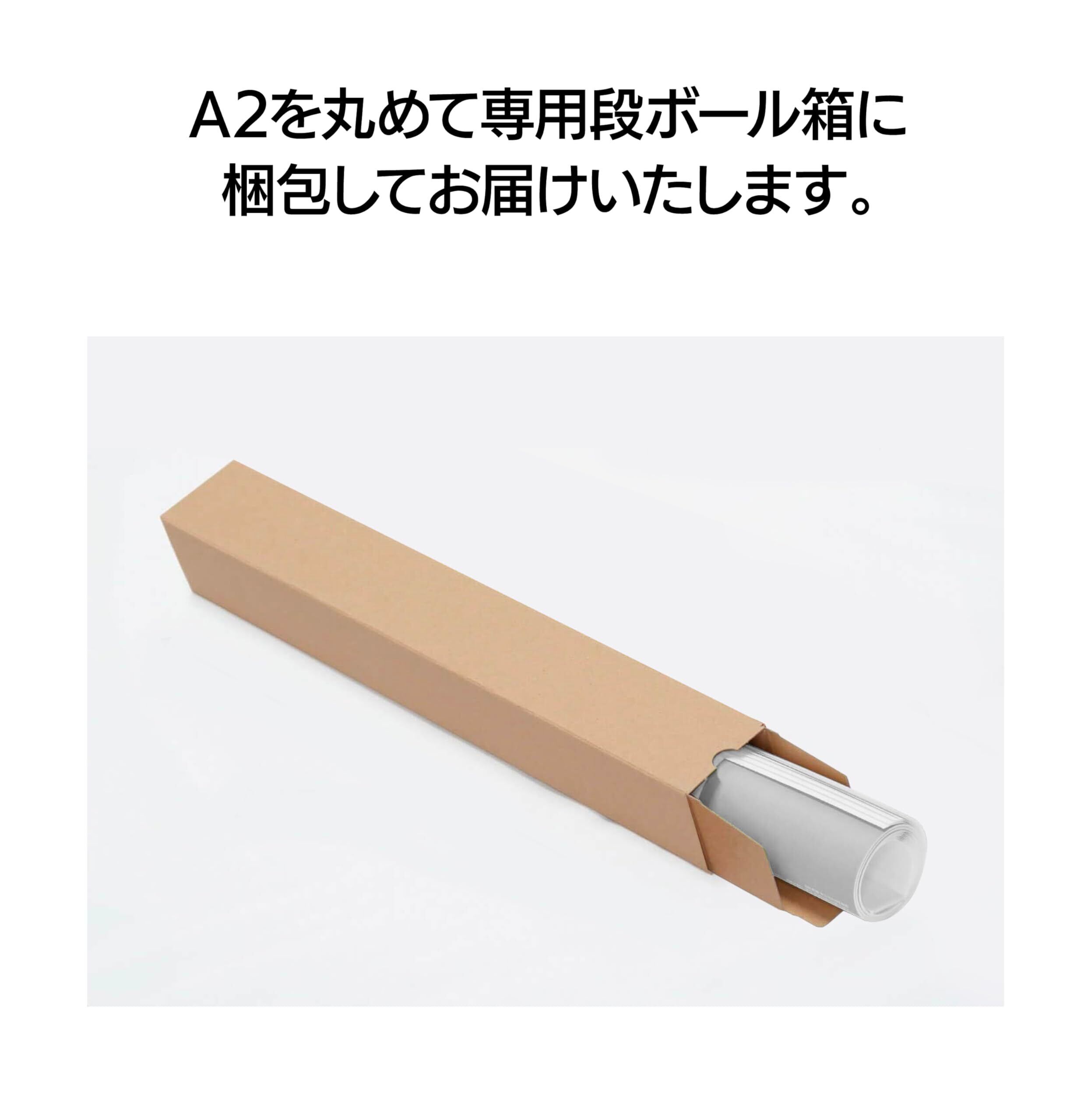 A2(w594×h420mm)サイズ A2を丸めてPP袋に入れて専用段ボールh445×w60×d60mmに梱包してお届けします。