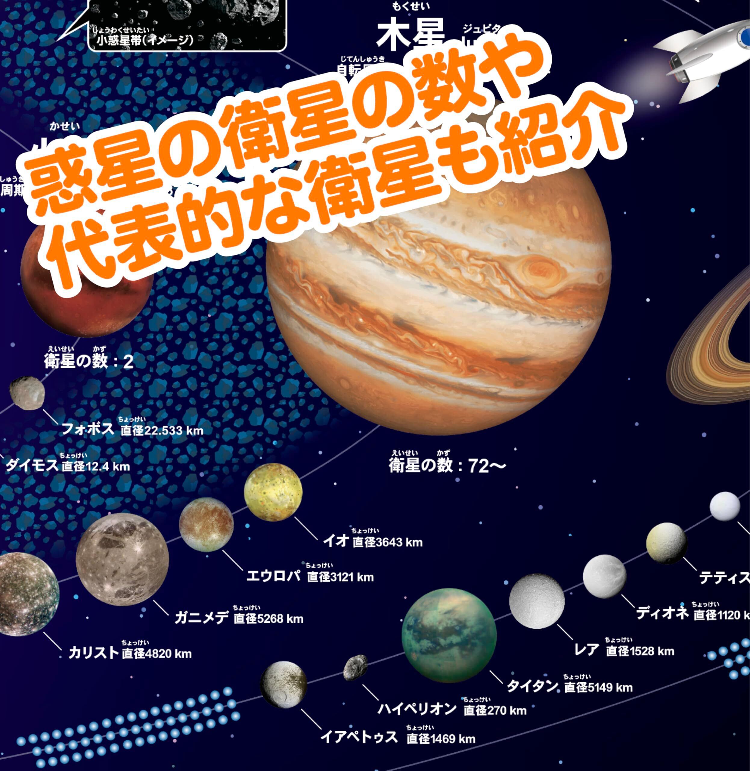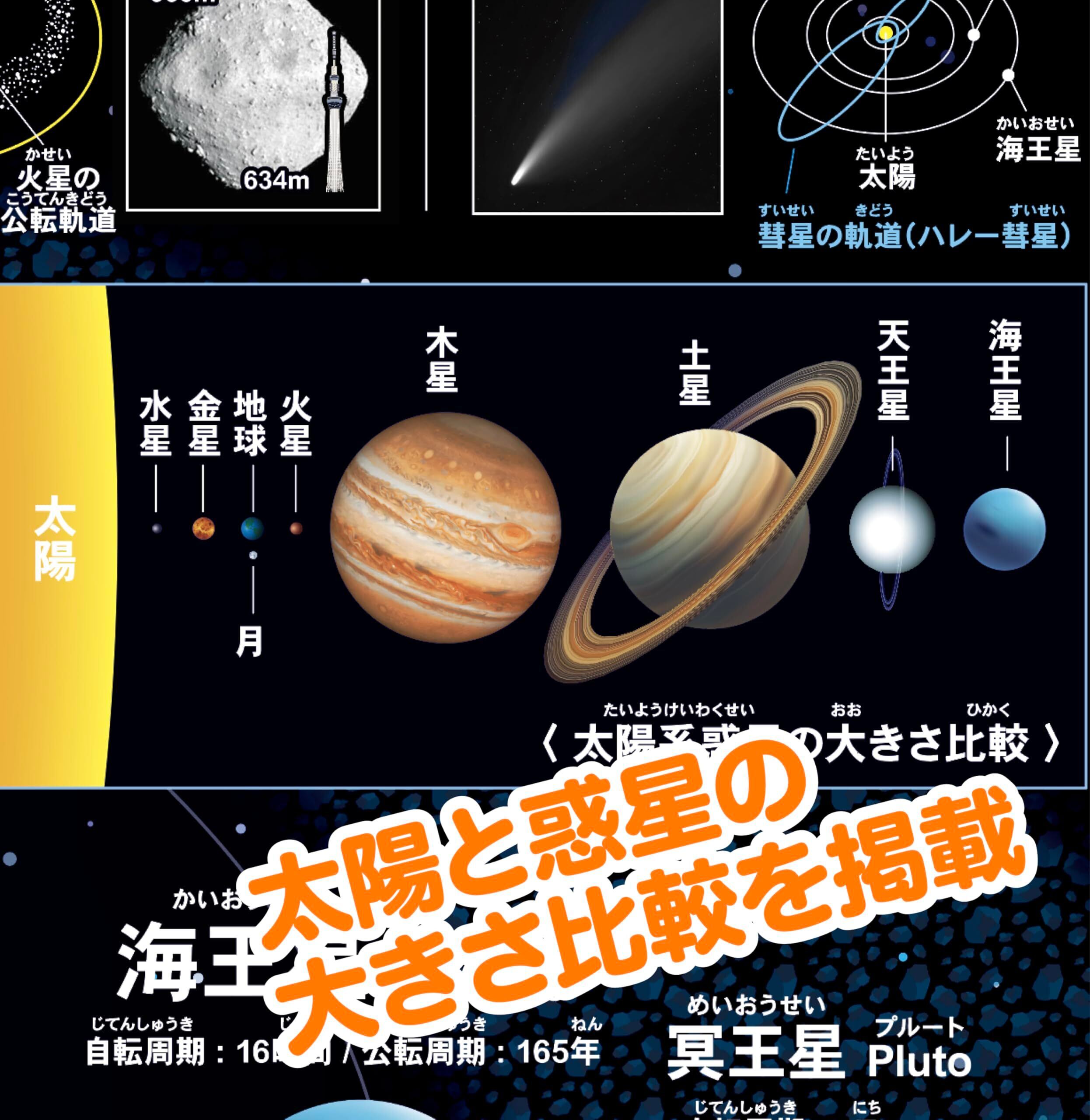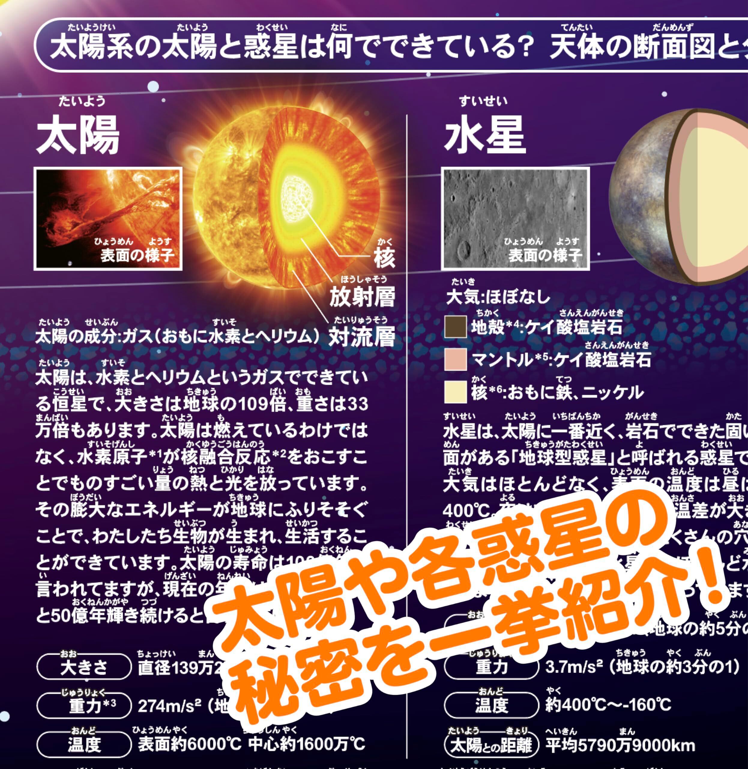 さらに太陽系にある太陽と、惑星の情報も記載。太陽系の基本情報がまるっと理解できます。