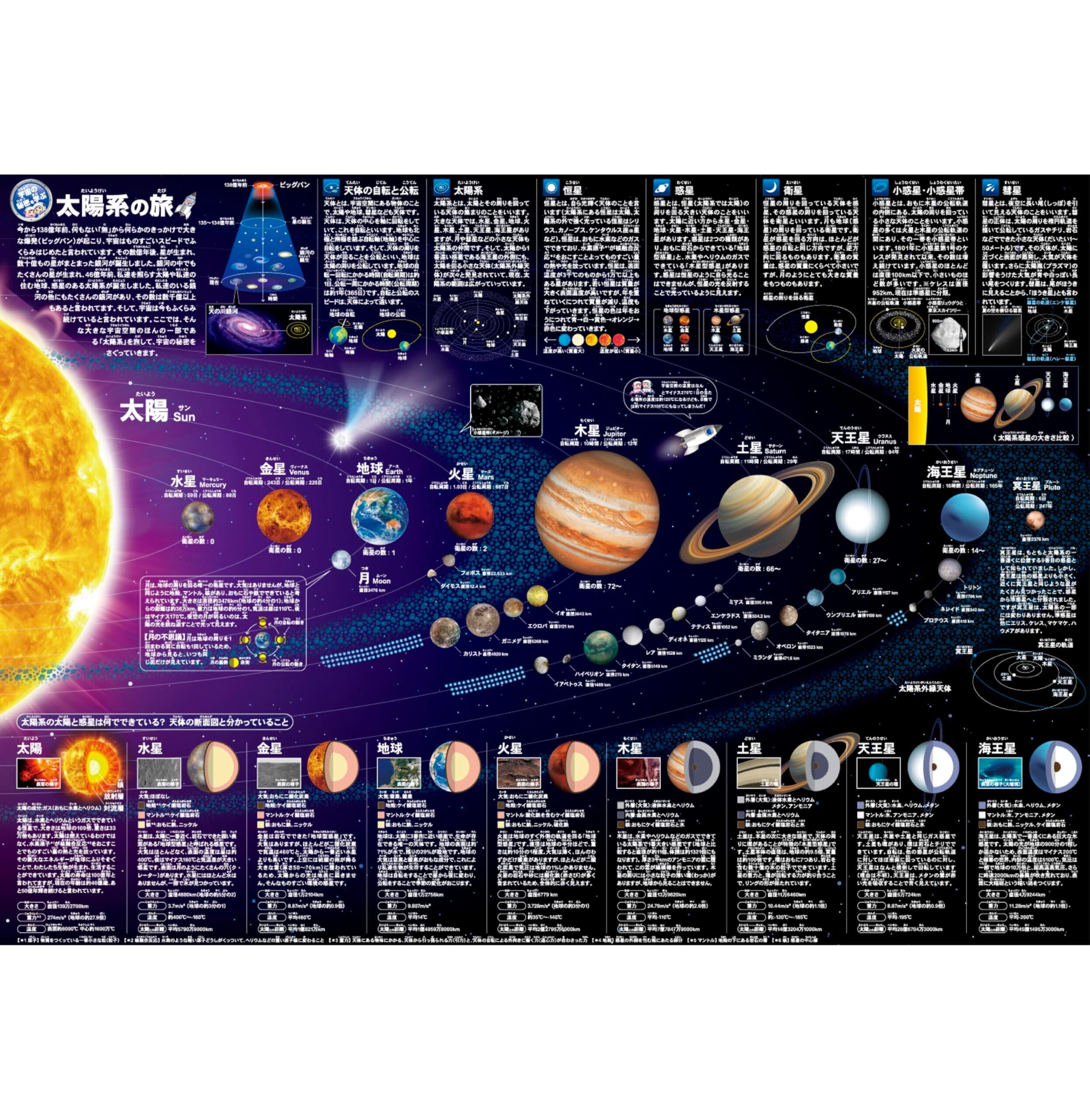 太陽系の情報を1枚のポスターに盛り込んでいます。これ1枚で太陽系の概要が理解できます。