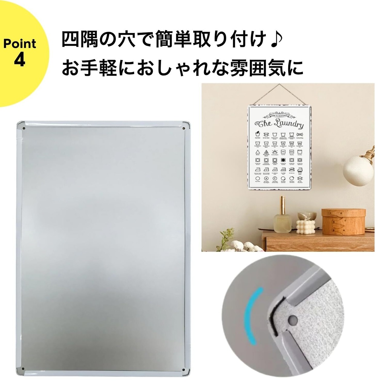 【設置も簡単・自由自在】四隅に穴が開いており、画鋲・ピン・ロープ・両面テープなどで自由に取り付け可能。