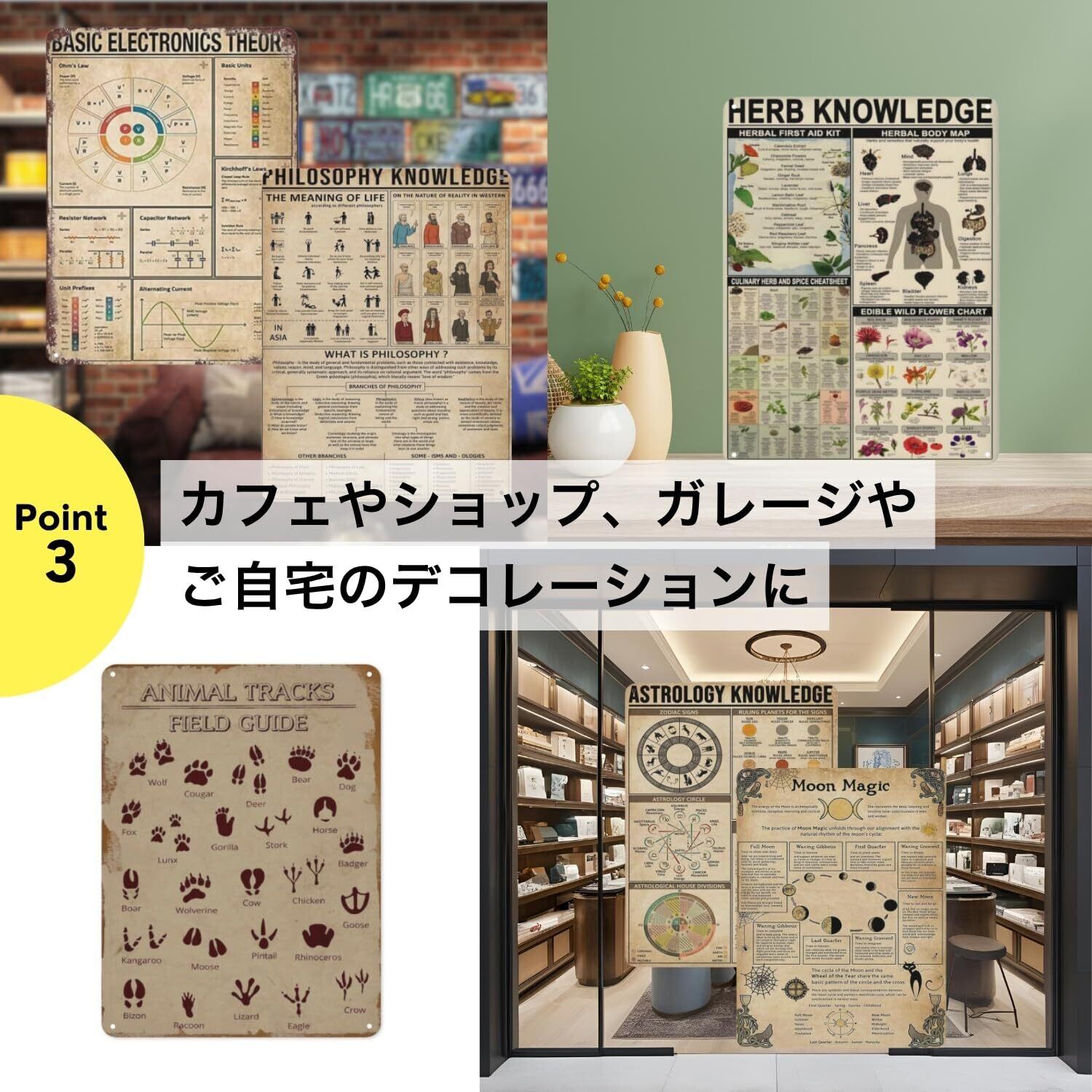【ユニークな知識系デザイン】科学ポスターや蛇vsマングースの対決、人体解剖図、飲食系インフォグラフィックなど、遊び心と知識が詰まったデザイン。会話のきっかけにもなる楽しい壁面装飾です。