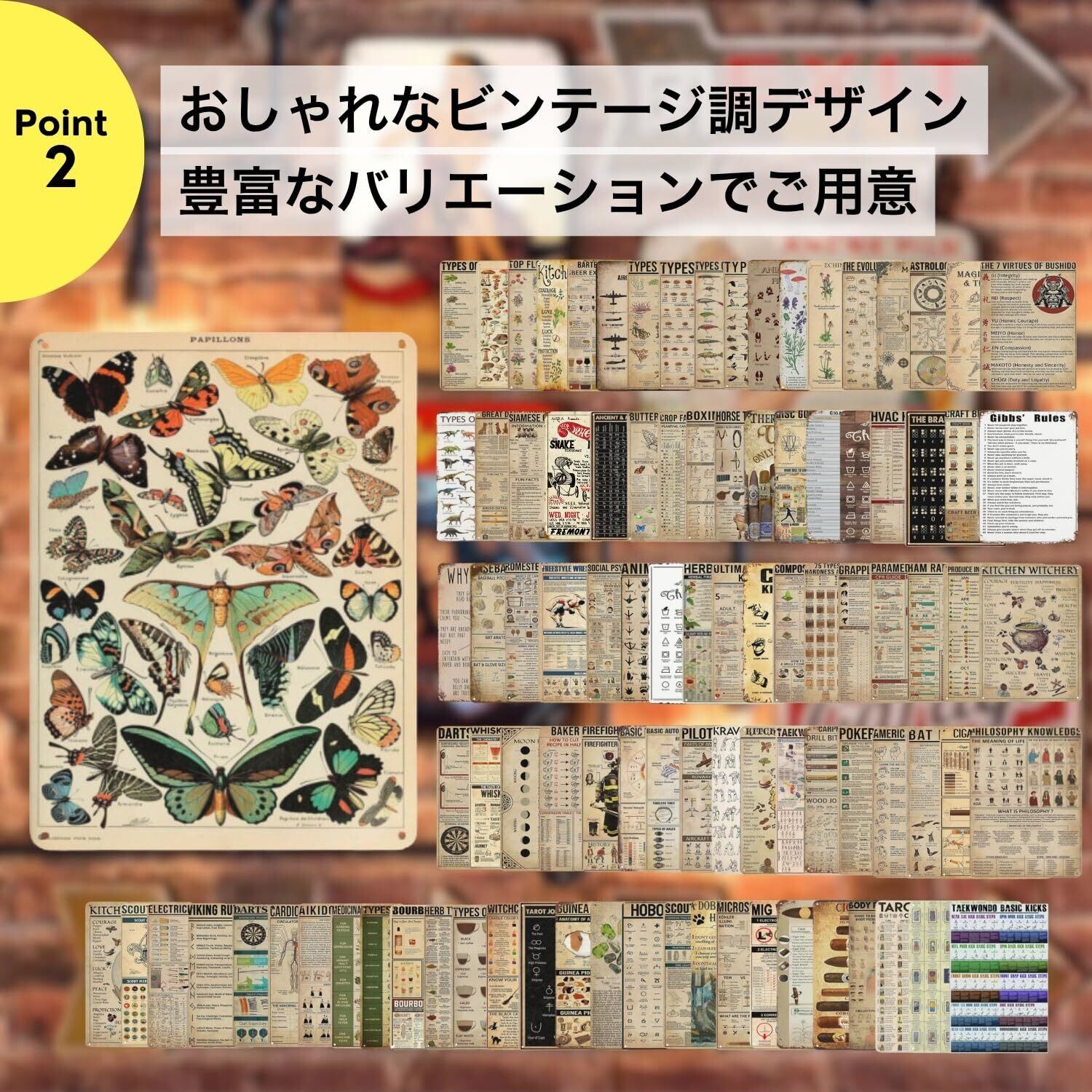 【サイズ・バリエーション】豊富な25デザインのレトロブリキ看板。サイズは約20×30cm、軽量設計で設置も簡単。アメリカンな雰囲気を演出する店舗装飾やお部屋のアクセントにぴったりです。