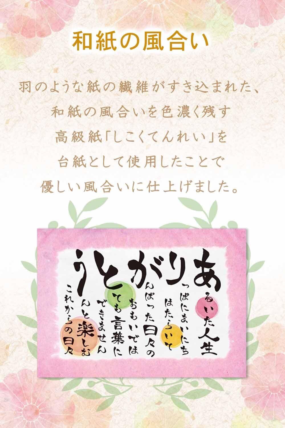 羽のような紙の繊維がすき込まれた、和紙の風合いを色濃く残す高級紙「しこくてんれい」を台紙として使用したことで優しい風合いに仕上げました。一文字一文字味わいのある「ありがとう」の言葉と共に、心温まるメッセージをプレゼントすることができます。
