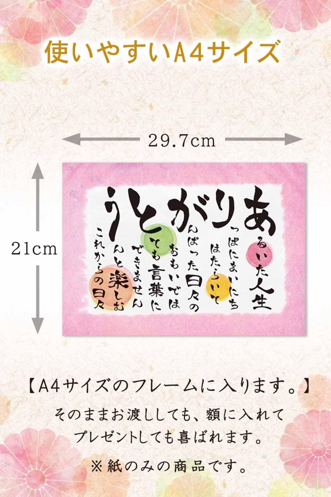 退職祝いにぴったり!アートポスターで大切な方に感謝の気持ちを贈りませんか。インテリアにもなるアート作品で気持ちを伝えることができる、心温まるプレゼントです。 羽のような紙の繊維がすき込まれた、和紙の風合いを色濃く残す高級紙「しこくてんれい」を台紙として使用したことで優しい風合いに仕上げました。一文字一文字味わいのある「ありがとう」の言葉と共に、心温まるメッセージをプレゼントすることができます。 華やかなお祝いのシーンに合うオリジナルデザインとなっており、お花や記念品など退職祝いにおなじみのプレゼントと一緒に手渡す方も多いです。 しっかりとしたアートの台紙を折れ曲がる事のないよう専用の梱包でお送りしております。感謝状として手渡せるのはもちろん市販のA4フレームや額縁にぴったり合う大きさですので、リビングや寝室、玄関などお好きなところにインテリアとして飾ることができます。※用紙サイズ:A4(21㎝×29.7) 【重要】ギフト発送するお客様へ:購入者様ご本人以外の方へ発送をする場合、ギフトの設定をお選びください。ギフト設定でない場合、ご注文者の名前が無い状態で発送されます。ギフトの設定を選んで頂くようお願い申し上げます。ギフトの設定画面で金額表示の有無も設定できます。