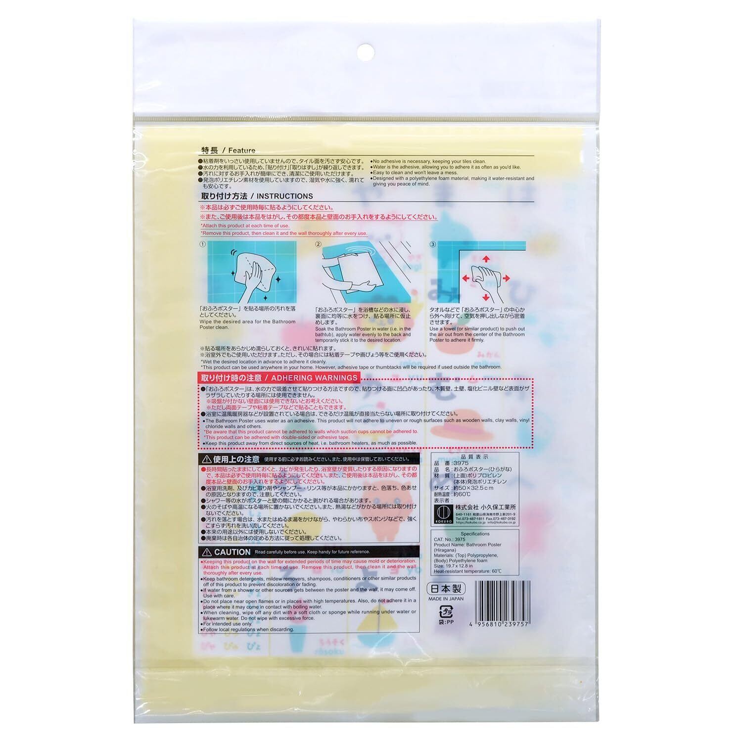 【特長】◎お風呂の壁に、水だけでペタッと貼れるポスター。◎お風呂に入りながら、かわいいイラストで学べます。◎お風呂タイムを楽しく。親子のコミュニケーションに。◎粘着剤をいっさい使用せず、水で貼るタイプなので、タイル面や壁面を汚しません。◎水の力を利用して「貼りつけ」「取りはずし」が簡単。◎繰り返し貼れます。何回でもきれいにはがせます。◎汚れてもお手入れしやすく、清潔に使えます。◎発泡ポリエチレン素材を使用していて、湿気や水に強く、濡れても安心です。◎ユニットバスやタイル壁に。◎日本製 MADE IN JAPAN