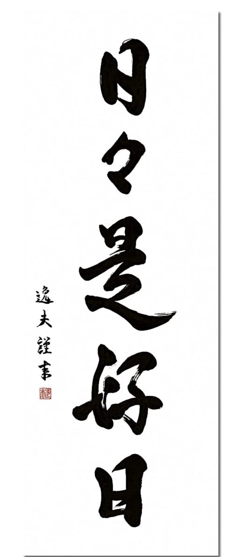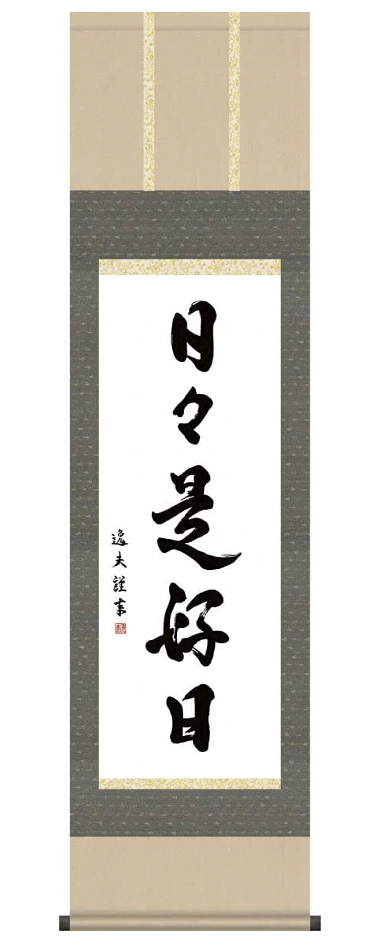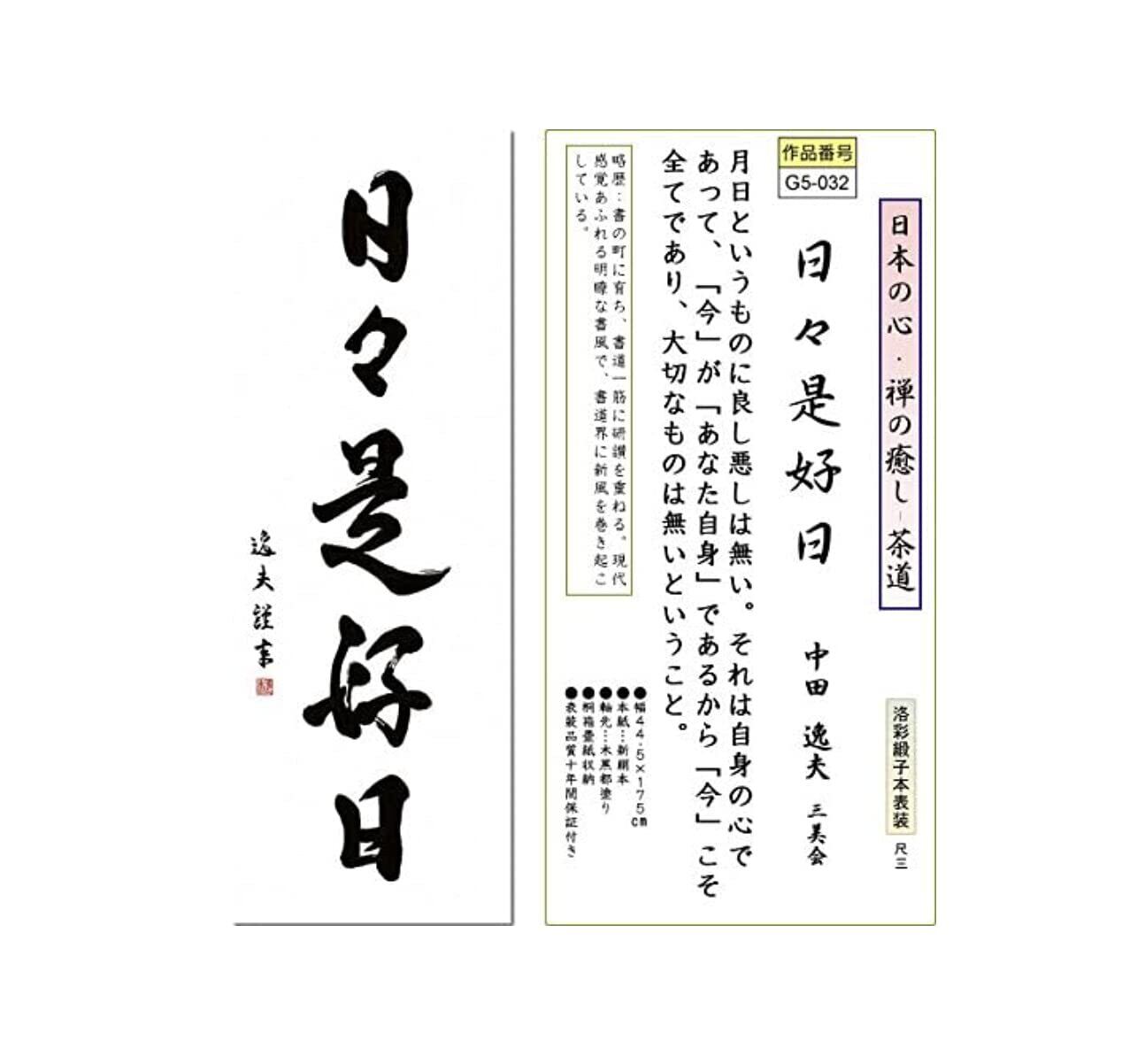 日本の心・禅の癒し-茶道 月日というものに良し悪しは無い。それは自身の心であって、「今」が「あなた自身」であるから「今」こそ全てであり、大切なものは無いということ。 日本の代表的な文化の一つである茶道。お茶席の床の間には「墨蹟」を掛けることが決まりとなっています。床の間に掛けられた禅語を理解し、その心を敬い徳を賞翫する。徳の高い禅の心が、床という格別な場を格調高く演出します。味わい深い禅語が日々の暮らしを心豊かにしてくれるでしょう。お茶席だけでなく、日常掛けとしてもお飾りいただきたい逸品です。 ●幅44.5×高さ175cm ●本紙・・・新絹本 ●軸先・・・木製黒都塗り ●桐箱畳紙収納 ●表装品質十年間保証付き 日本画構図の開発と国内生産品にこだわった製品です! 作品は特殊印刷に手彩色仕上げとなっています。