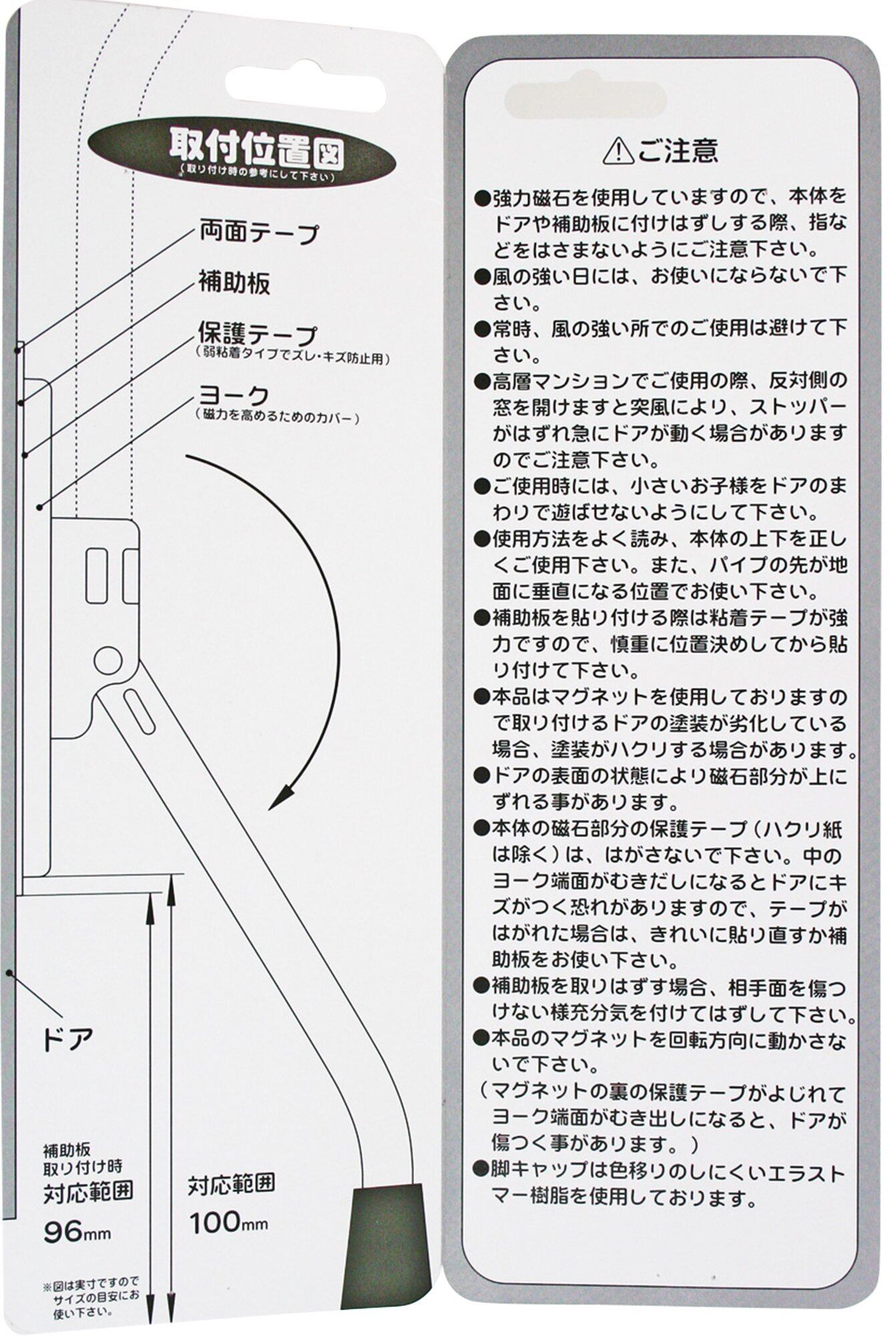 マグネット(強力磁石)と貼り直し自在のウレタン系保護テープのダブル効果でドアをがっちり固定してドアをストップ。 ちょうどいい所でドアを止められます。 大型強力ゴムキャップは地面と常に垂直にあたり、止まりが良くなっています。 補助板が付属されていますので、木やアルミのドアにも固定できます。 脚ゴムキャップも予備が1つ付属。