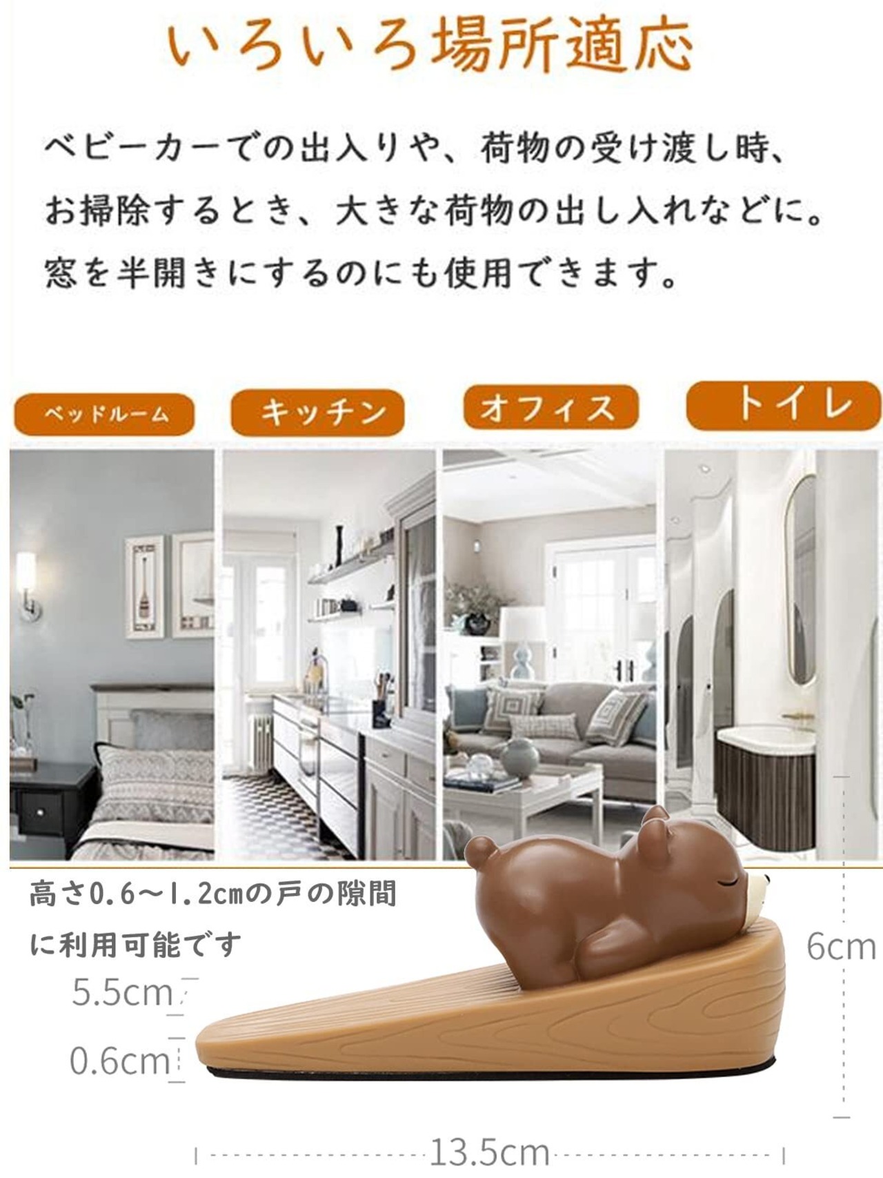 【ドアにに傷つけない】小さいので、玄関の隅に置いておいても邪魔になりません。 先端が細く、差込むだけですので設置も非常に簡単です。標準は0.6-1.2cmの隙間に入られます、カーペットやセメントやタイル張りなどにも適用です。ドアと地面の隙間に設置するだけではなく、壁とドアの間に置くことで、ドアが壁に当たる衝撃を和らぎ、傷を防ぐこともできます。