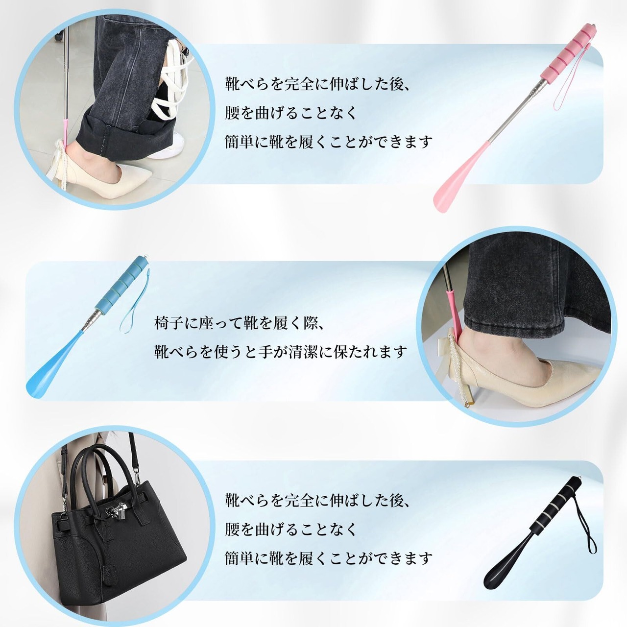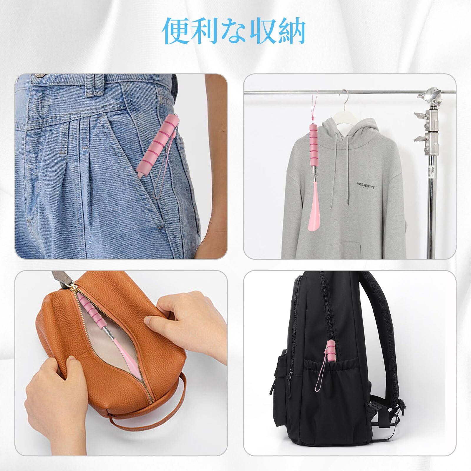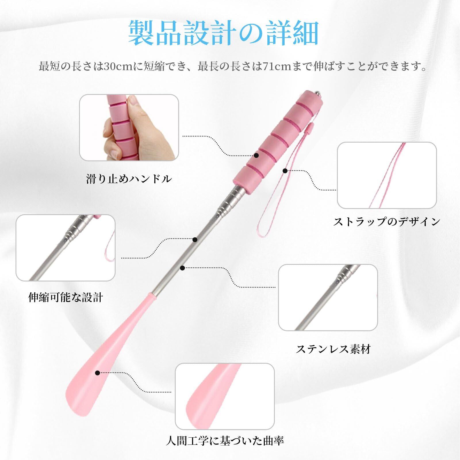 格納式靴べら:当社の靴べらは、ニーズに応じて長さを調整でき、最小長は30cm、最大長は71cmです。男性、女性、お子様、お年寄りまでお使いいただけます