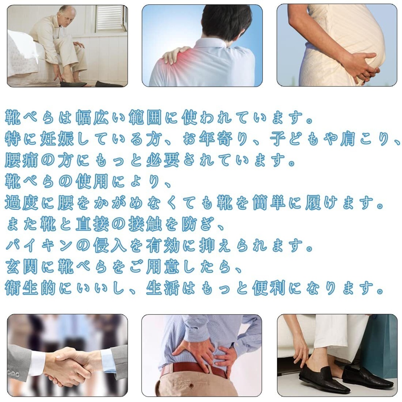 靴べらは幅広い範囲に使われています。特に妊娠している方、お年寄り、子どもや肩こり、腰痛の方にもっと必要されています。靴べらの使用により、過度に腰をかがめなくても靴を簡単に履けます。また靴と直接の接触を防ぎ、バイキンの侵入を有効に抑えられます。玄関に靴べらをご用意したら、衛生的にいいし、生活はもっと便利になります。