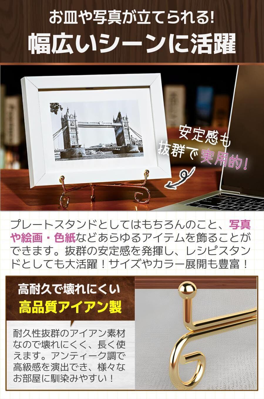 【幅広いシーンに活躍】プレートスタンドとしてはもちろんのこと、写真や絵画・色紙などあらゆるアイテムを飾ることができます。抜群の安定感を発揮し、レシピスタンドとしても大活躍!サイズやカラー展開も豊富!