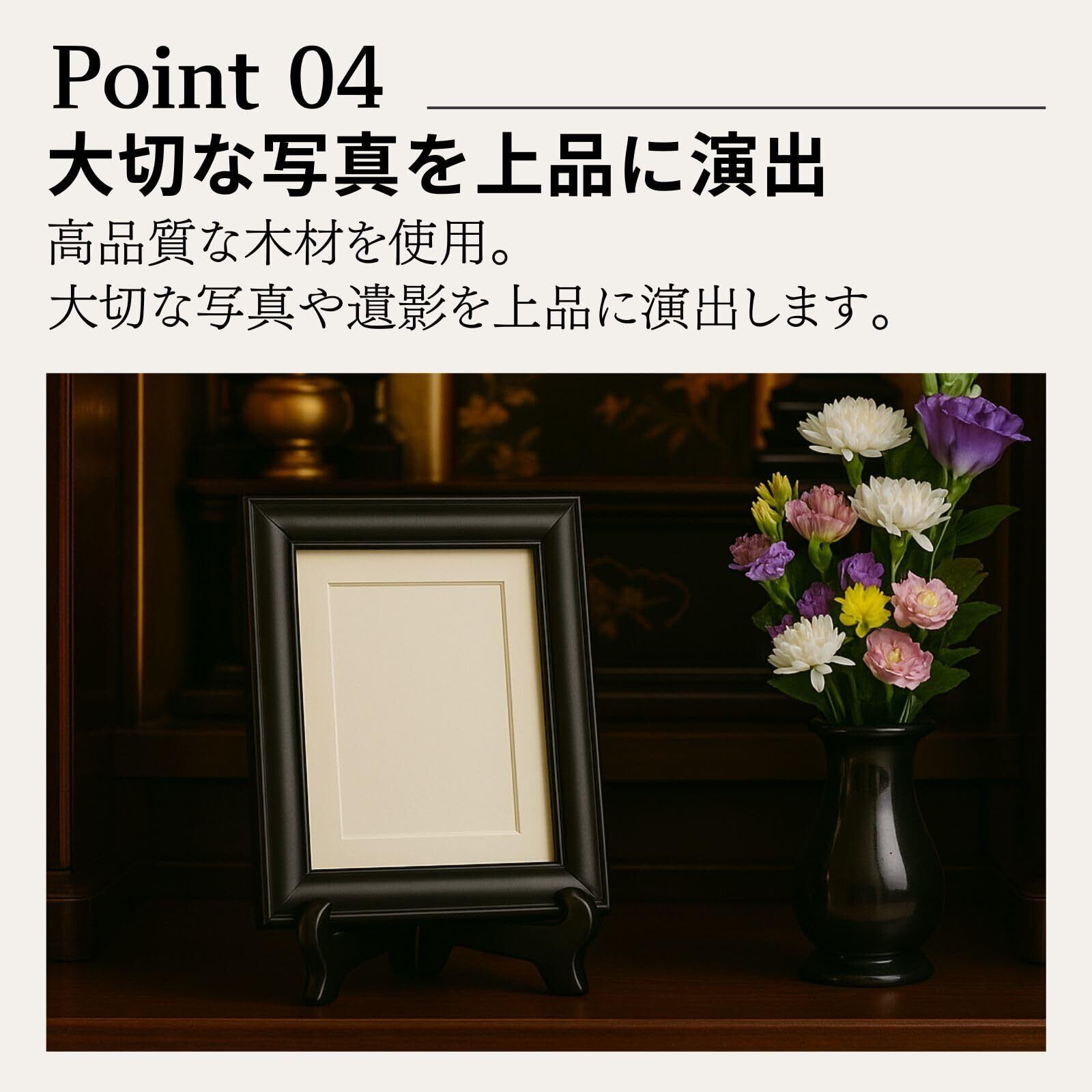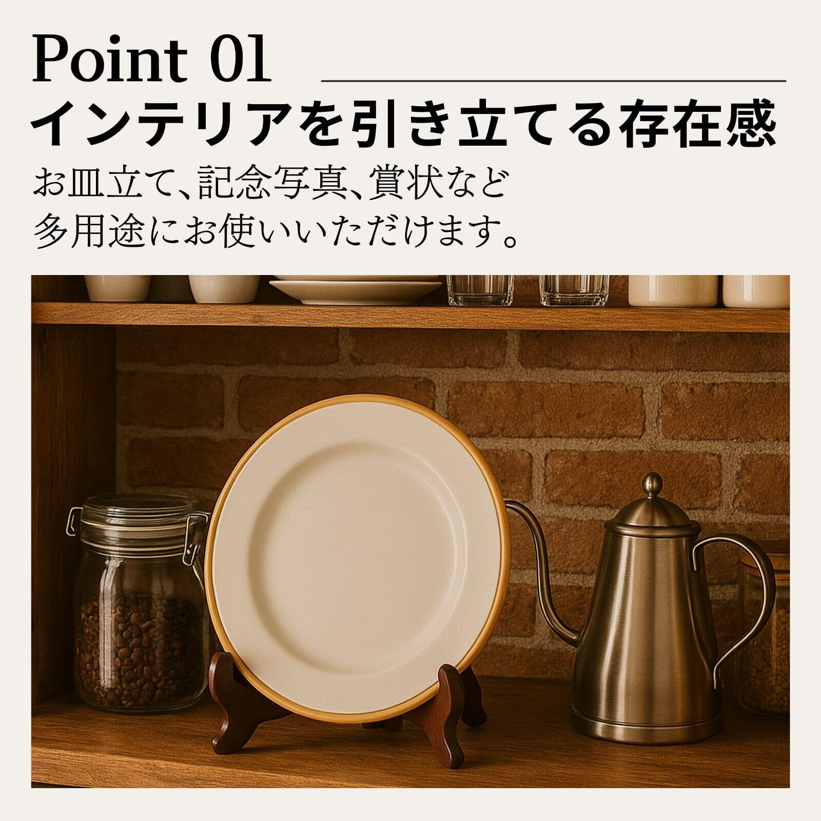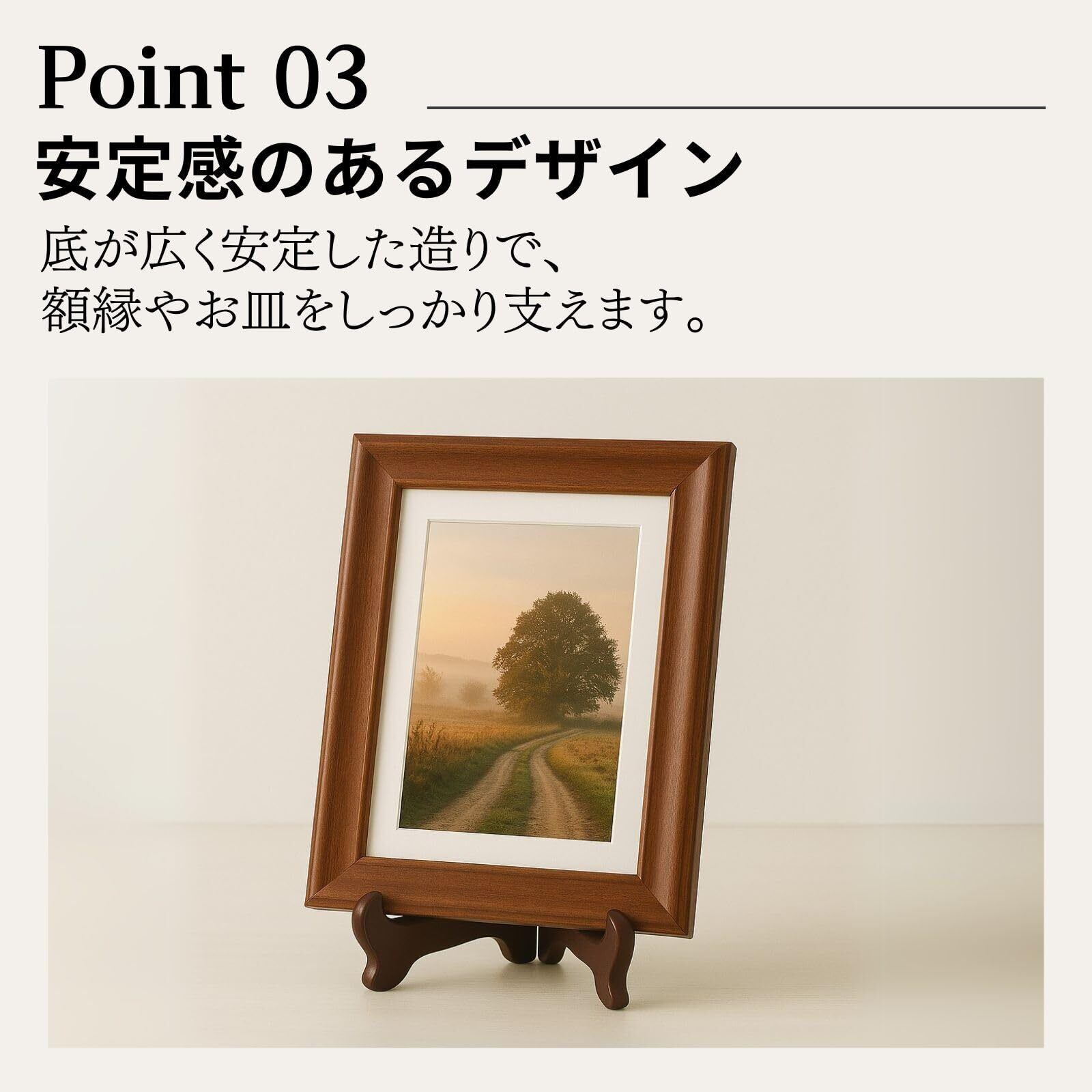 【A4・大判サイズも安定して設置】 高さ約30cmで、A4サイズの額縁やパネル、一般的な賞状額、大きめのお皿もしっかりと支える安定感のある設計です。料理本やタブレットを立てて使う際も倒れにくく、快適にご利用いただけます。もちろん、故人を偲ぶ大切な「遺影立て」としても、四つ切りサイズの額縁などを安心して設置できます。接触部分には、飾るものを傷つけにくい配慮も施されています。