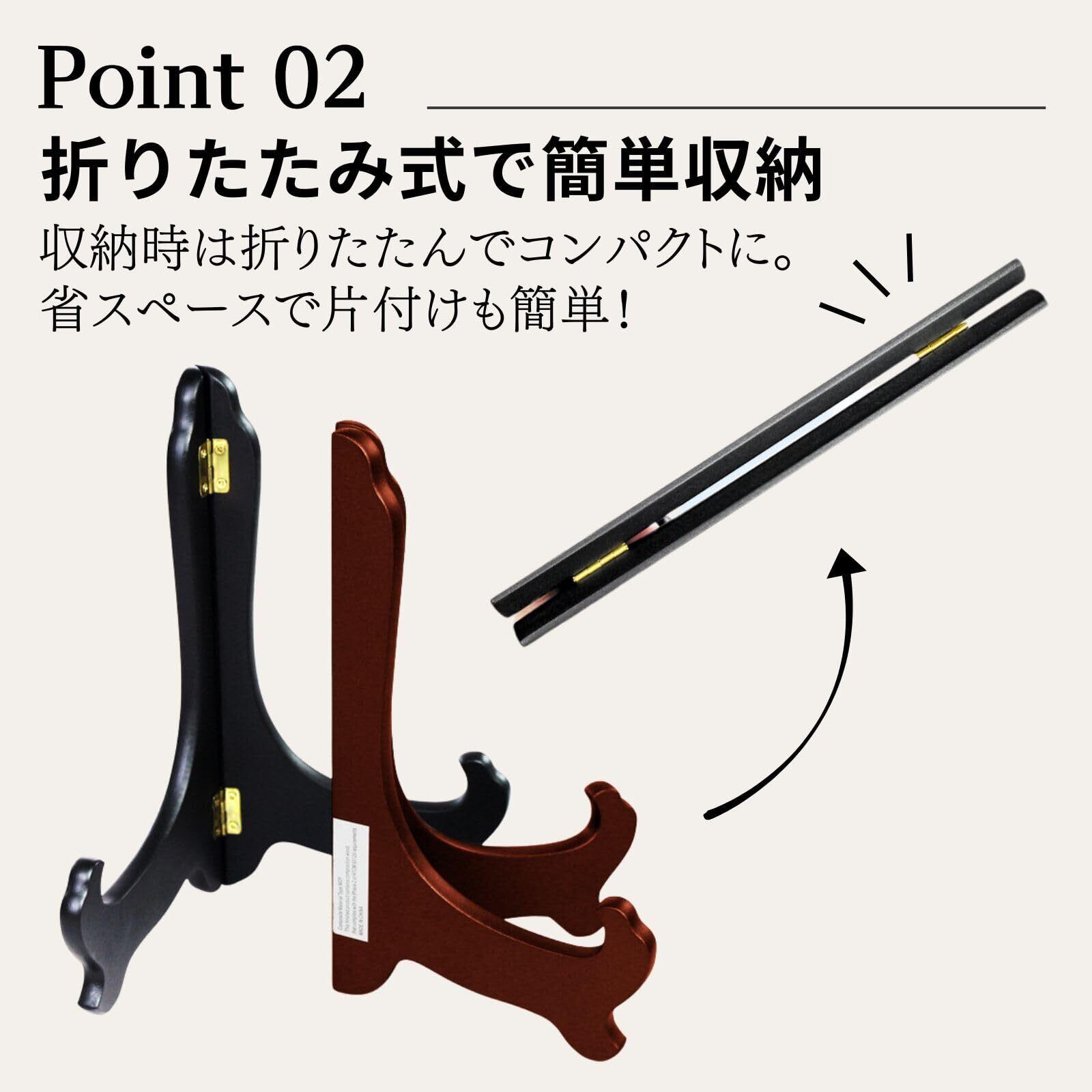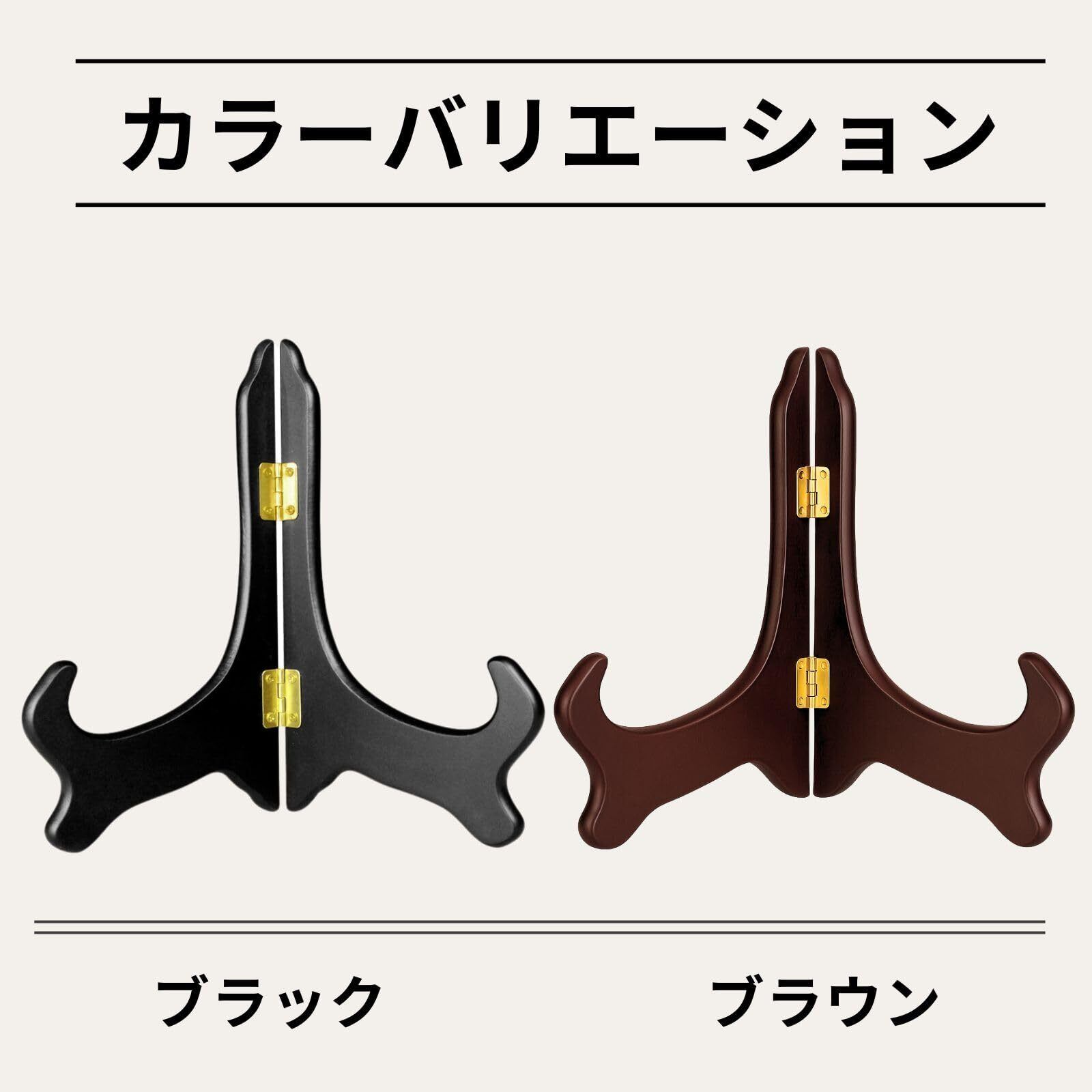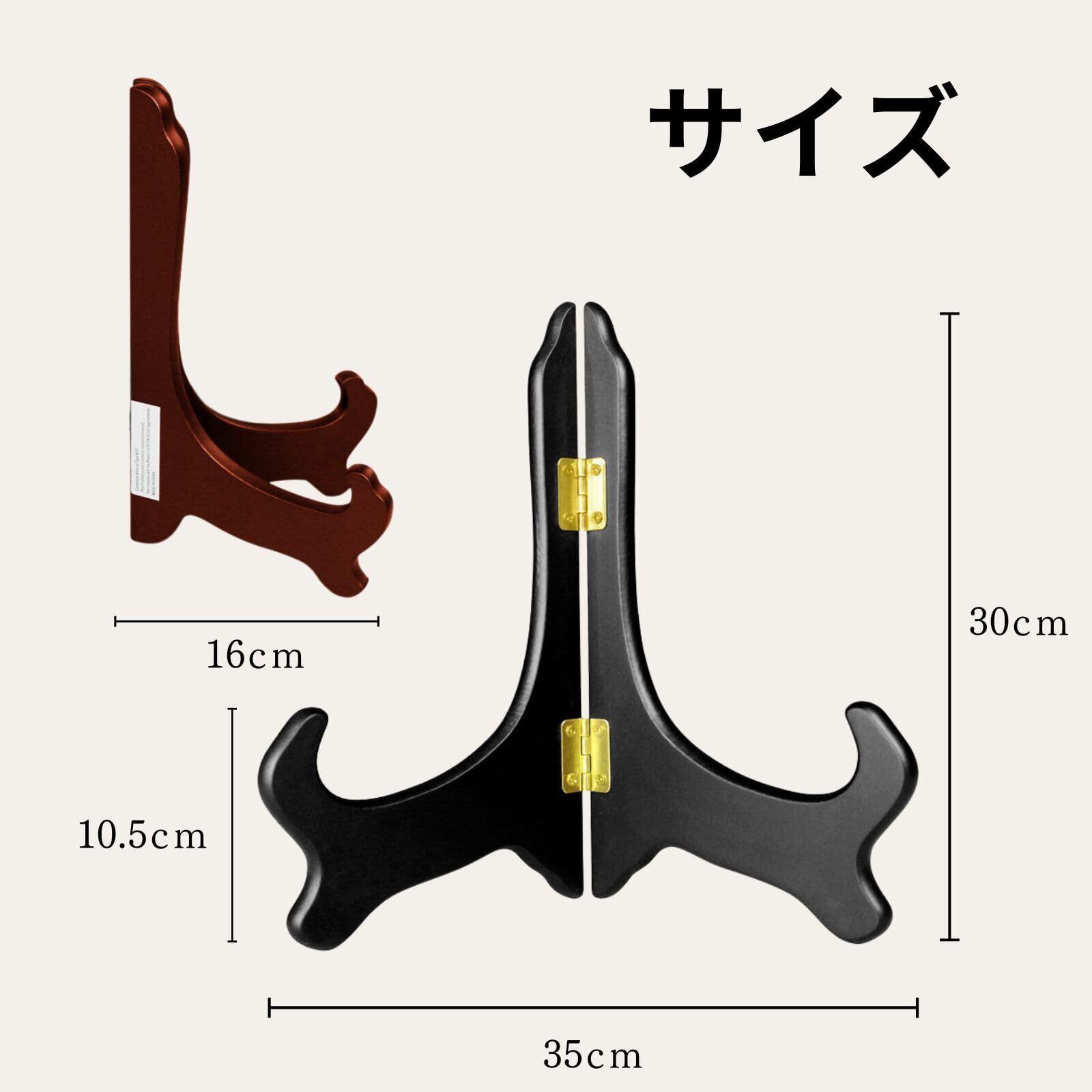 【アイデア広がる多様な使い方:製品仕様】 皿立て、レシピスタンド、写真立て、遺影立て、額縁立て、パネルスタンドとしてはもちろん、本立て(ブックスタンド)、タブレットスタンド、レコードジャケットのディスプレイ、お店のメニュースタンド、ウェルカムボード立てなど、アイデア次第で様々なシーンに活用できます。「製品仕様」サイズ:高さ約30cm × 幅約17.3cm / 素材:木製 / カラー:ブラック、ブラウン。