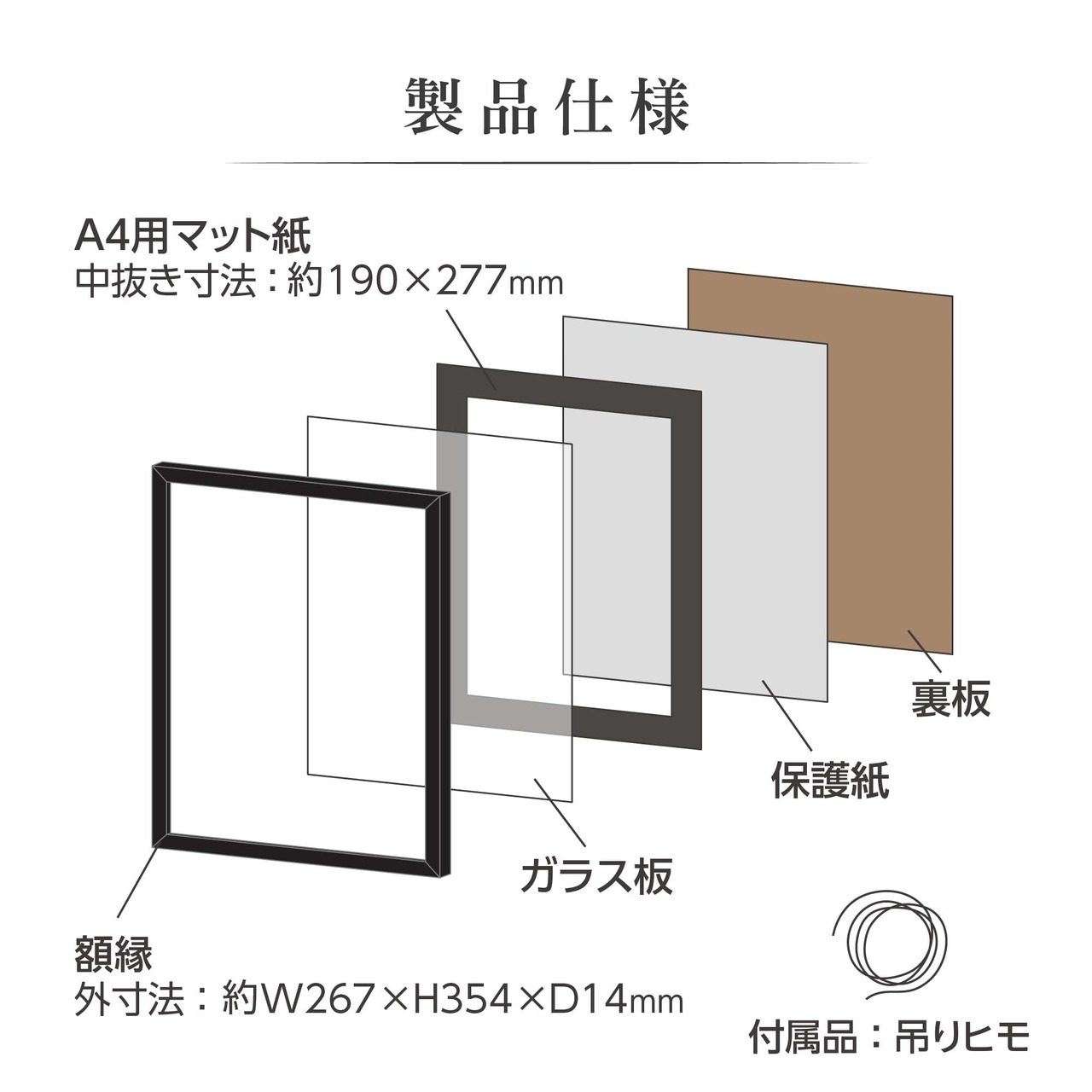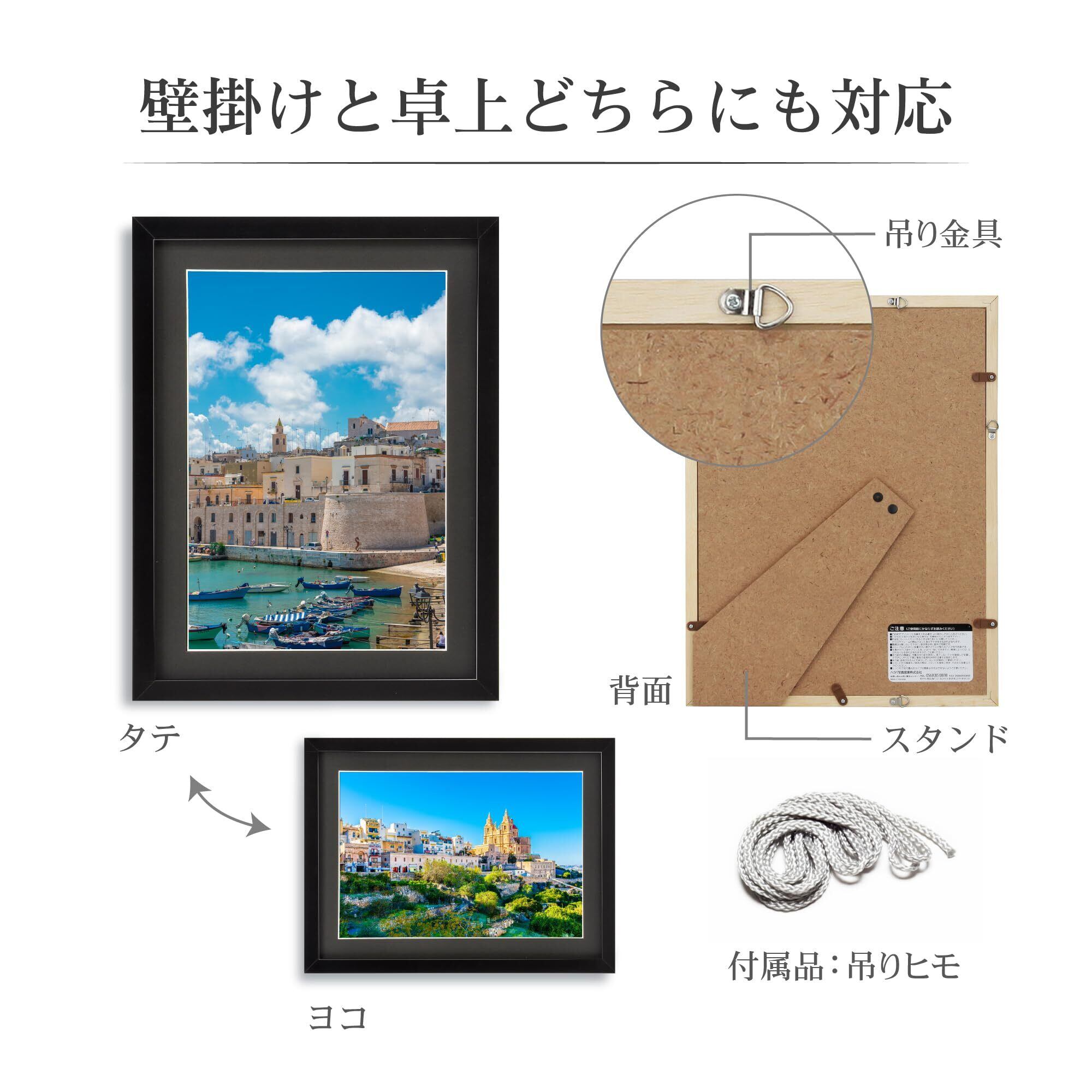 プレゼントにも適した白い厚紙製の上下箱入り。全サイズに吊ヒモ付属、2L、6切、A4サイズには背面にスタンドがついています。