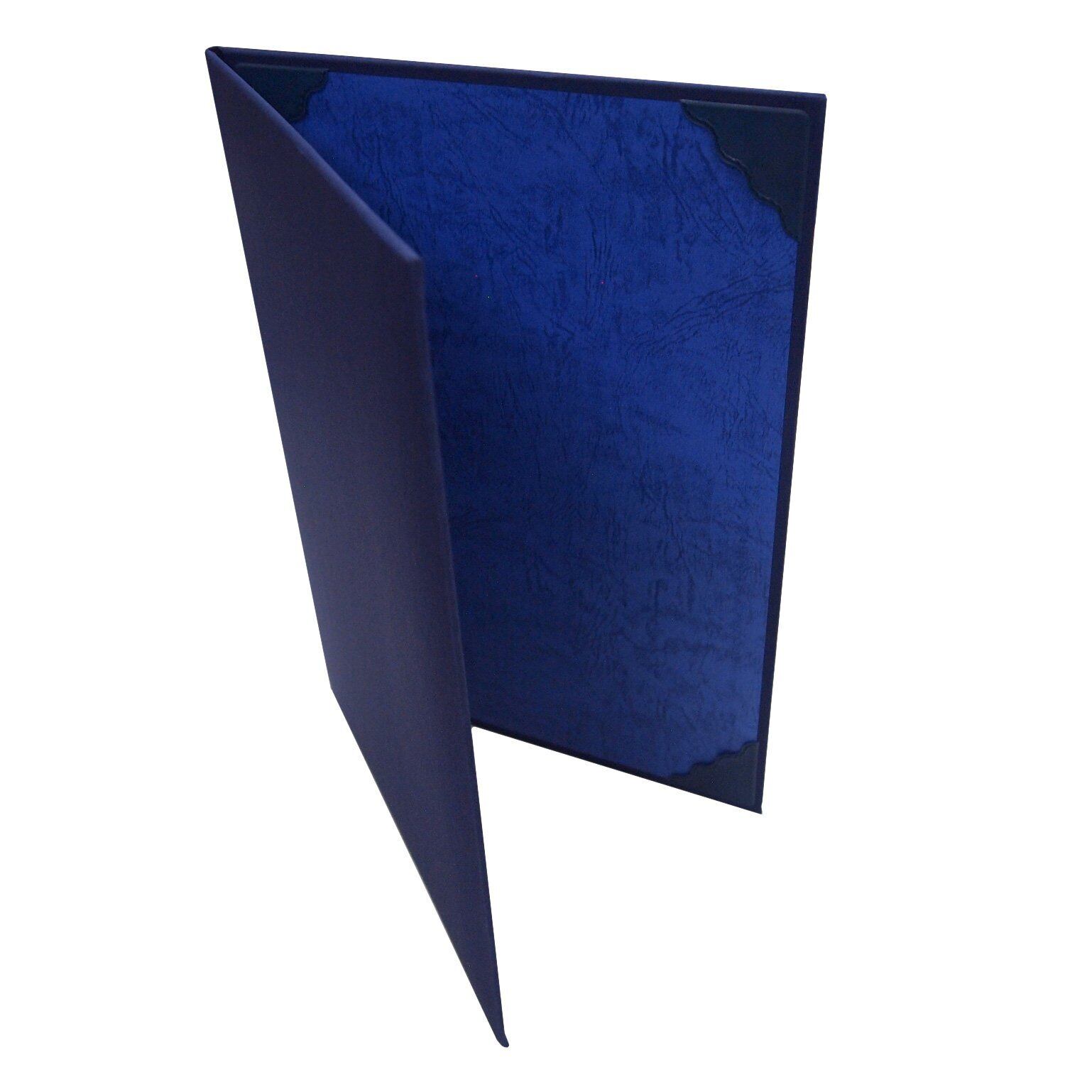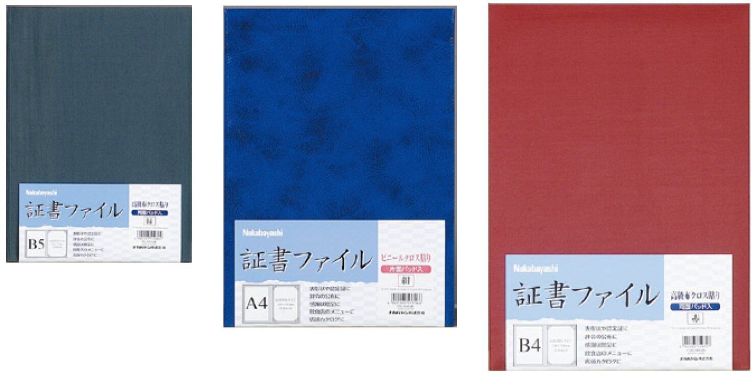 1冊からお買い求め頂けるパック仕様、証書ファイル。オフィスで贈呈する感謝状や認定証、免状を入れるのに最適です。飲食店のメニューや店舗の案内などにもご利用になれます。クロス表紙・二つ折りタイプ/A4判。 <布クロス/両面パッド入> ・規格:A4判 ・証書収容サイズ:210x305mm ・表紙クロス:ポリエステル ・パッド:両面ウレタンパッド ・見返紙:特殊紙 ・コーナー:塩化ビニール