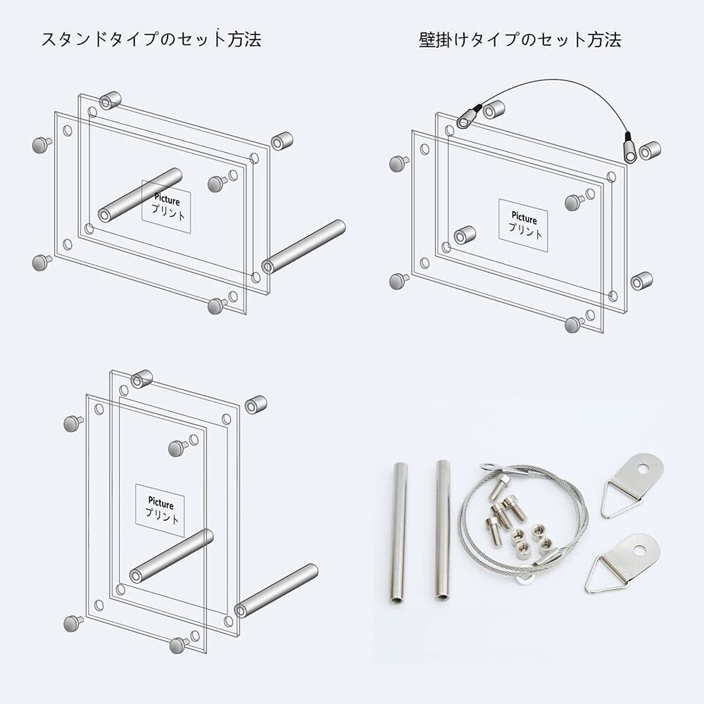 【壁掛け方&机置き方】アクリル板2枚で写真を挟みこんで飾ります。アクリル板にオスやメスのネジを取り付ければセットアップ完了、縦置きか横置き、フレームを支えてる支柱の位置を変えると置き方が変えられます。ワイヤーをフレームに装着すると壁に掛ける事が出来ます。写真などの交換もカンタン。到着後保護膜を剥がしてください。