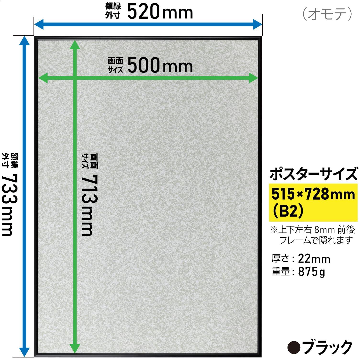 【製品仕様】本体サイズ:(H)73.3×(W)52.0×(D)2.2cm / 収納ポスターサイズ:B2 (H)72.8×(W)51.5cm / 内寸(画面サイズ):(H)71.3×(W)50.0cm / 表面材:PET(UVカット) / 重さ:875g / フレームカラー:ブラック / 生産国:日本