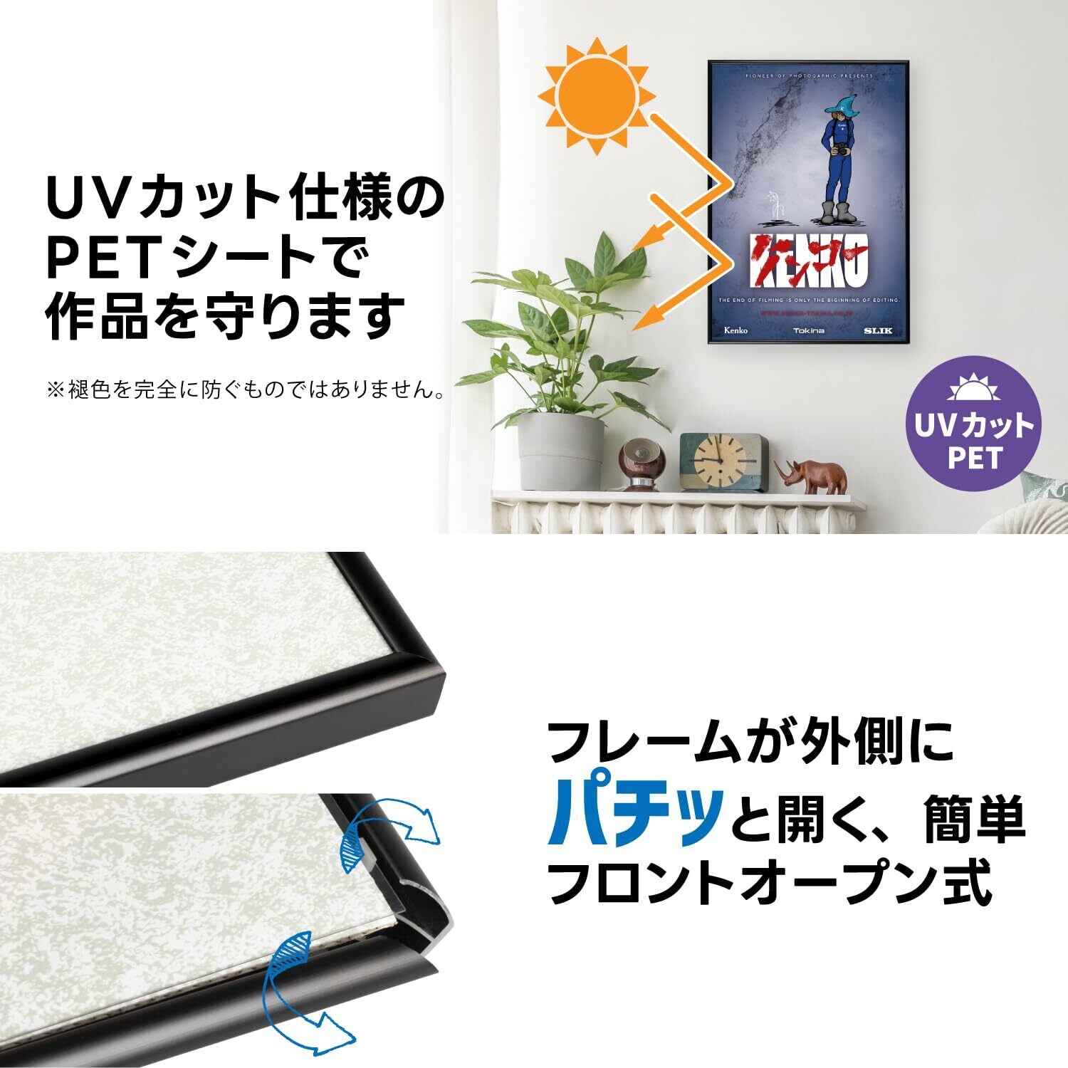 【色褪せを軽減するUVカットPET素材採用】印刷物の色褪せ(日焼け)の原因となる紫外線をカットする、UVカット素材のPET表面材を採用。大切なポスターの退色を軽減します。(100%防ぐ効果はありません。)