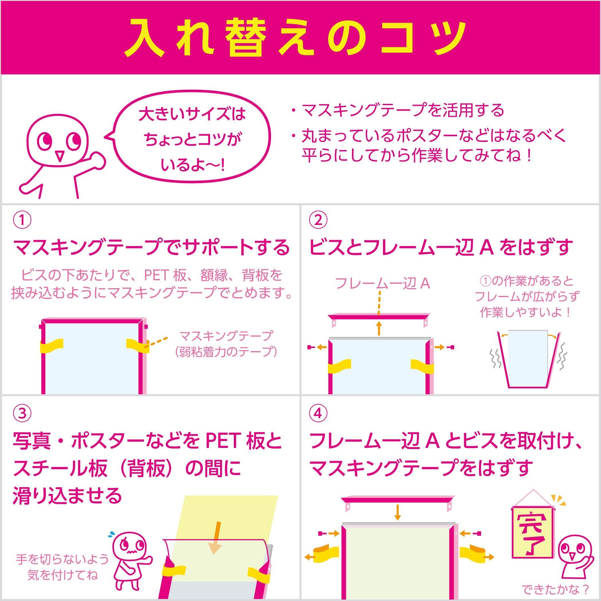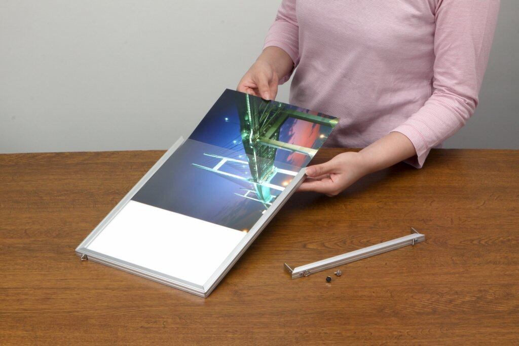 写真やポスターを差し込むだけでセットできます。フレームはアルミ製。ボードは発砲スチロールのため、とても軽いです。