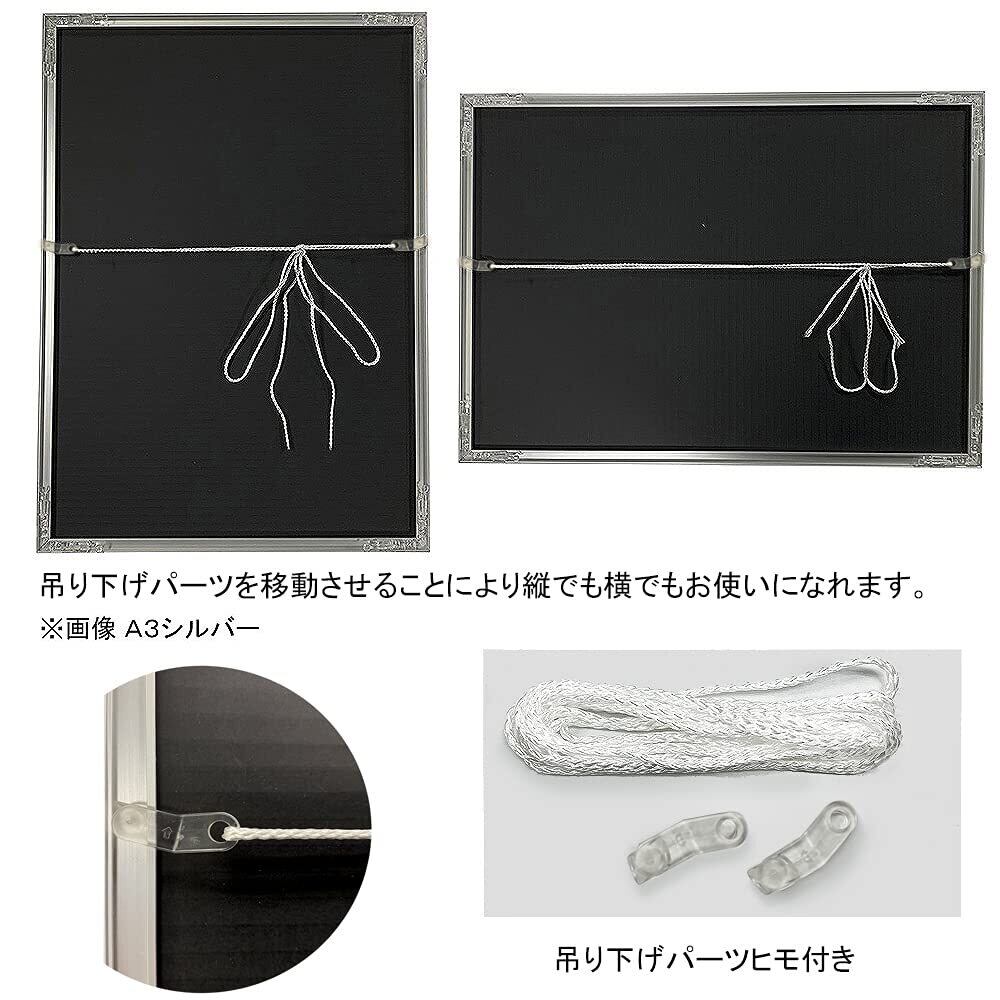 吊り下げパーツとヒモも付属。壁に掛けた時、裏面からかけひもが見えません。表面には0.8mmの透明シートを使用。中材が2枚入っており、1枚取り外すことにより2mmマット紙なども入ります。最大3mmまで対応。