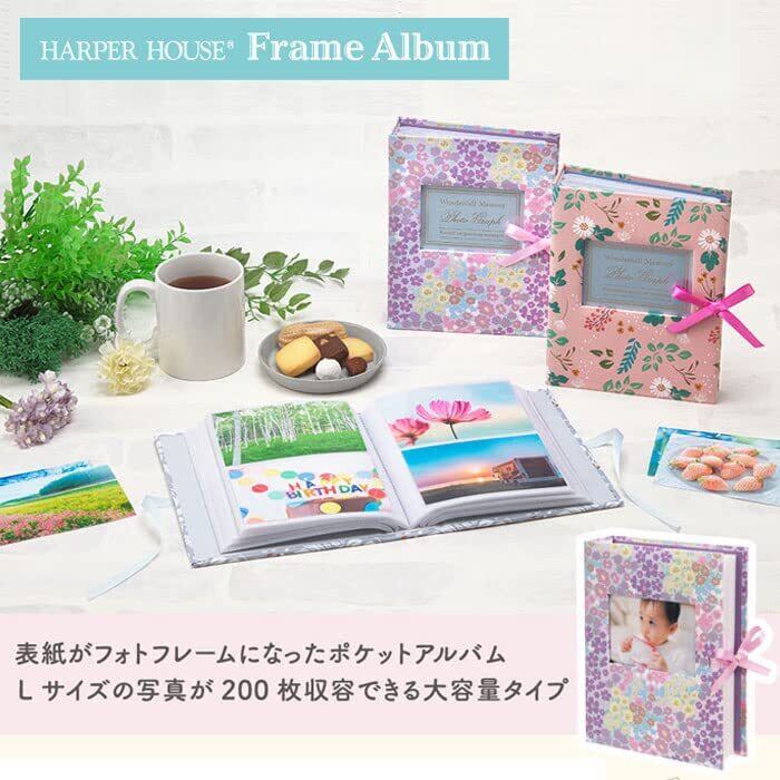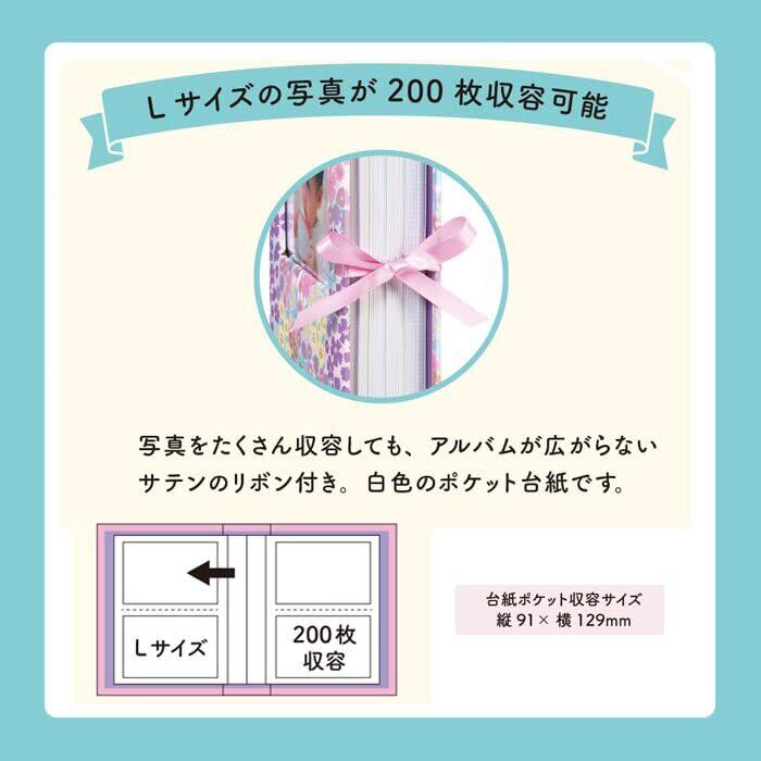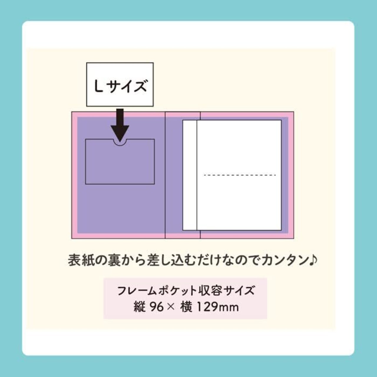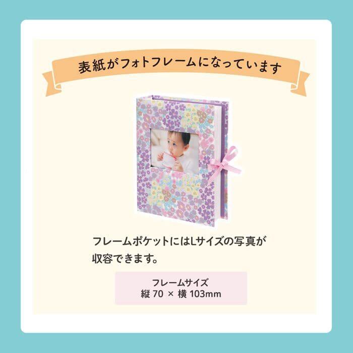 ●表紙材質/紙(マットPP、エンボス加工) ●中芯材質/紙 ●フレームPOPカード材質/紙 ●フレームカバー材質/PVC ●リボン材質/サテン ●ポケット材質/PPエンボス ●パッド材質/紙 ●個包装材質/OPP ●溶着式ポケット白台紙50枚 ●フレームサイズ/縦70×横103mm ●フレームポケット収容サイズ/縦96×横129mm 表紙がフォトフレームになったポケットアルバム。 Lサイズの写真用紙が200枚収容できる大容量タイプ。 ●Lサイズの写真が200枚収容できる、大容量タイプのポケットアルバムです。 ●表紙にフォトフレームが付いているので、お気に入りの写真を表紙の裏側に入れて表紙にすると、世界に1冊だけのアルバムになります。 ●表紙はインテリアにも馴染むナチュラルな花柄デザイン。 ●写真をたくさん収容しても、アルバムが広がらないサテンのリボン付。 ●写真台紙の色はシンプルな白台紙です。