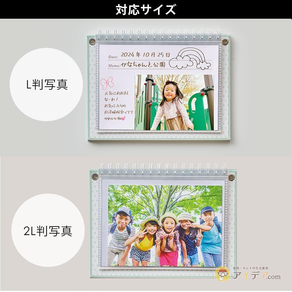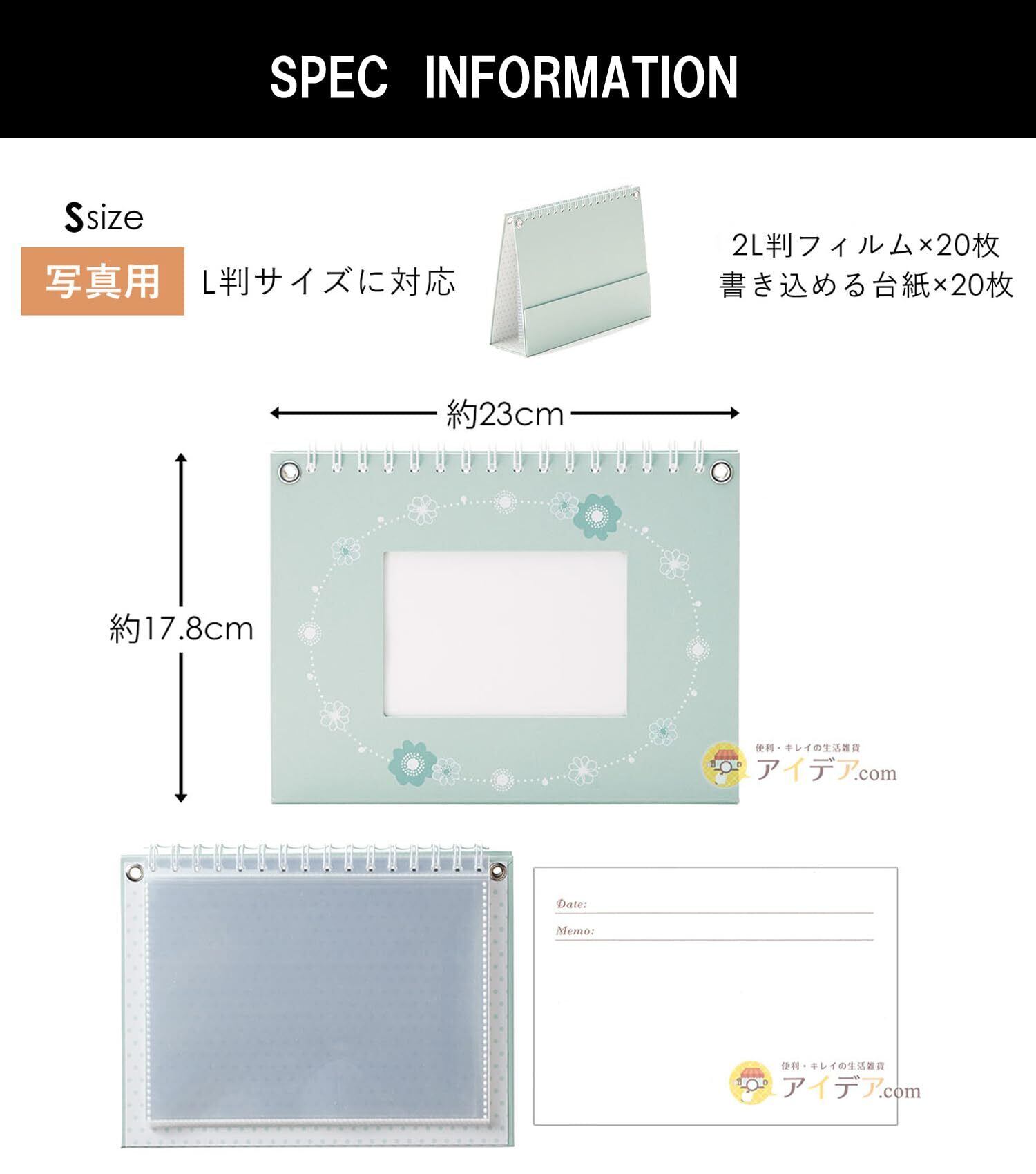 2L判サイズポケット×20枚(12.7×17.8cmまで対応)、メモ台紙×20枚が収納できる