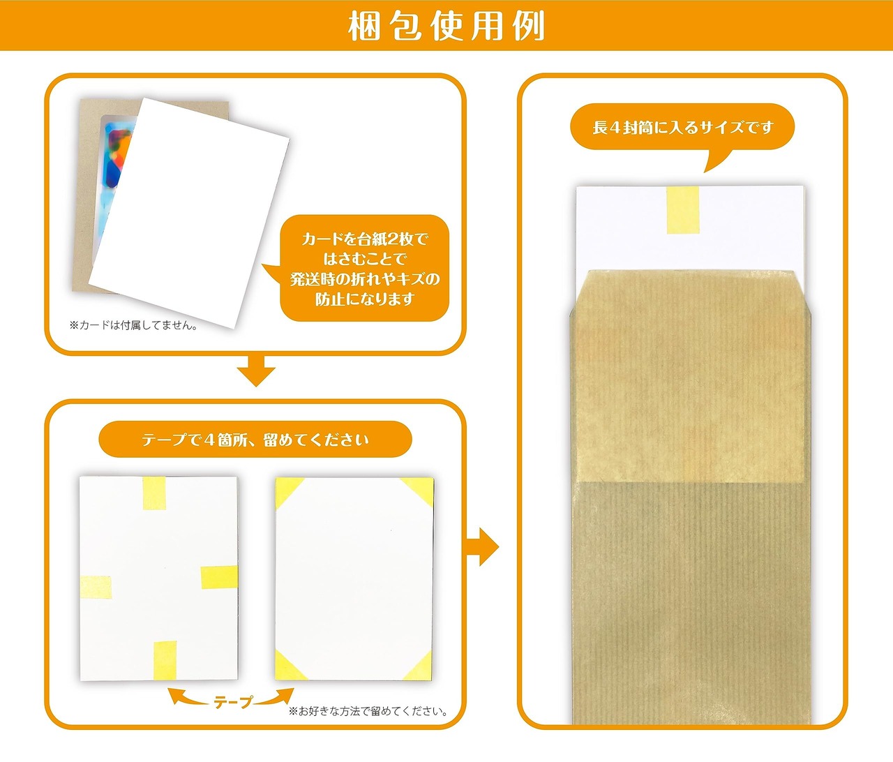 発送するものを台紙2枚ではさみ、4方をセロテープ等で留めてください。