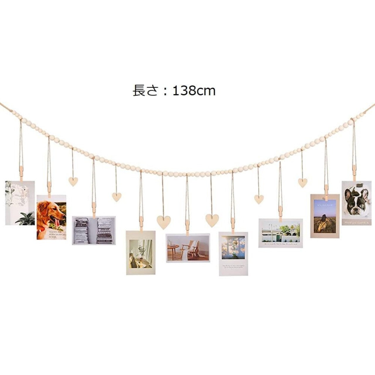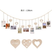 この壁掛け写真ディスプレイセットは、木製のビーズを綿ロープで結んだものです。取り外し可能な木製クリップが付いており、ハート模様のペンダントがいくつも弔り下げられています。良質の木材、完璧な設計、非常にユニークで美しいです。華やかで丈夫なエコ写真収納は、インテリアにぴったりです。