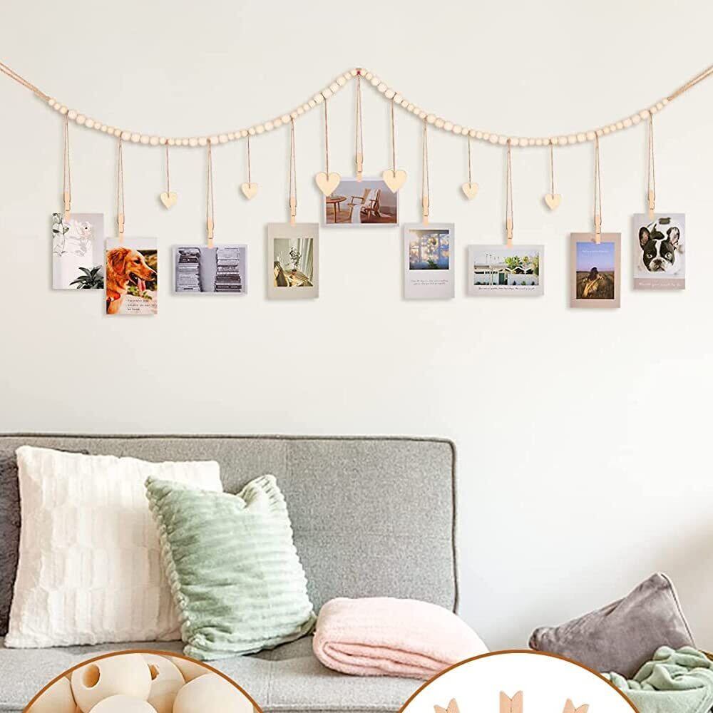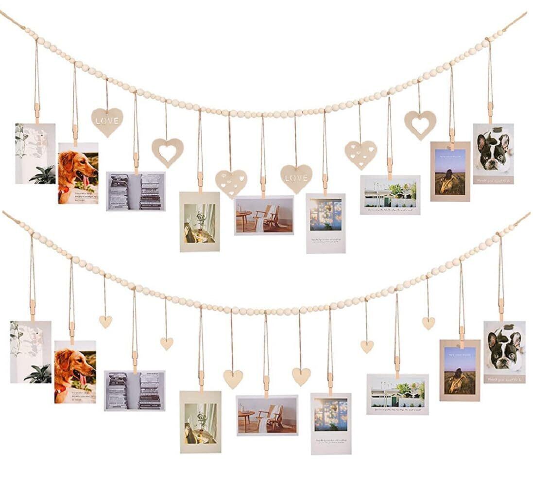 siawadeky 写真ガーランド 壁掛け 2タイプ入 写真ディスプレイ 木製ビーズ写真収納 クリップ付き 写真ストリング フォトホルダー 木製フォトガーランド 写真飾り 背景壁装飾 ボヘミアン 部屋飾り