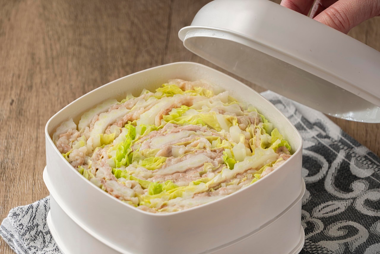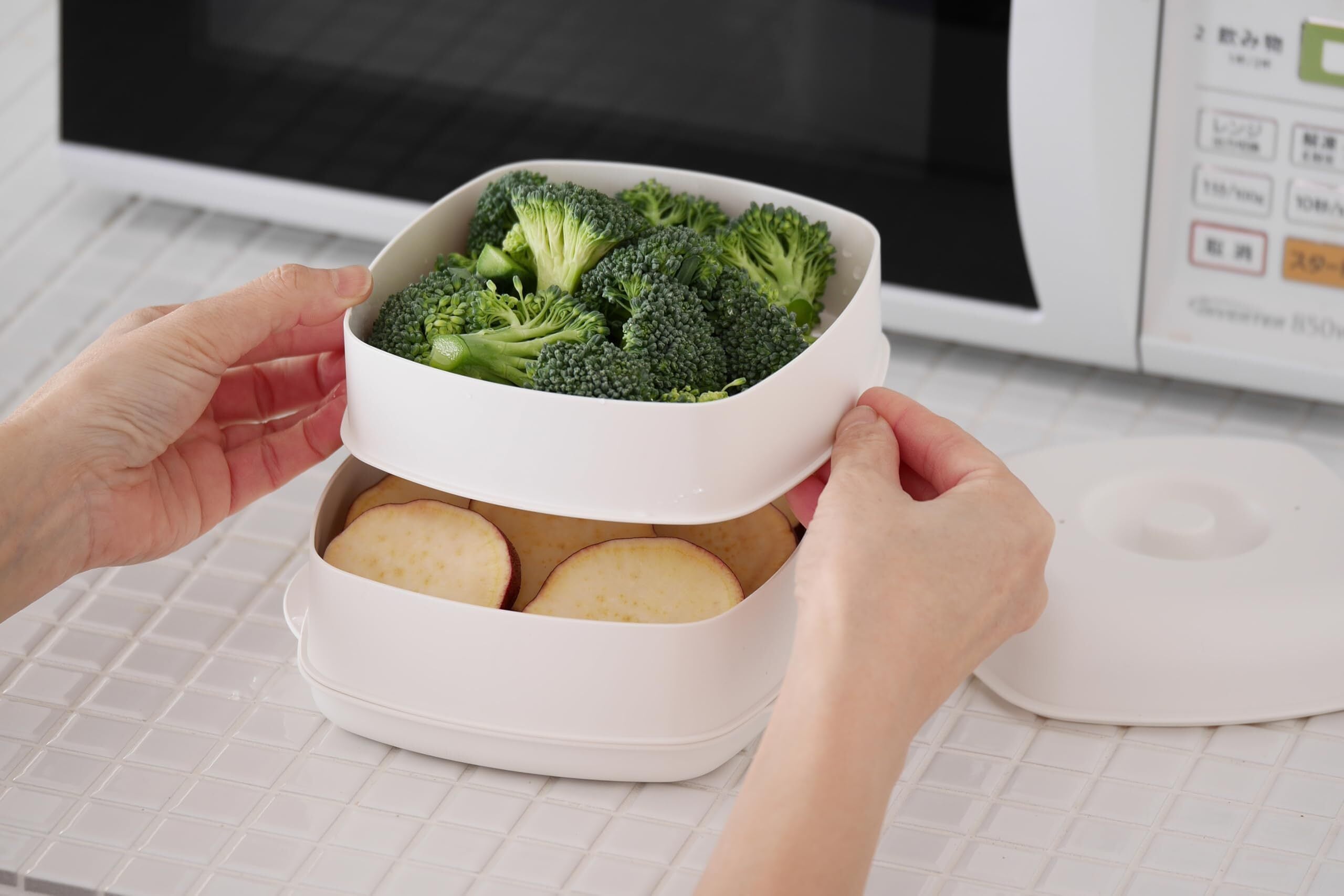 2つの食材を同時に調理できる電子レンジ用せいろです。
