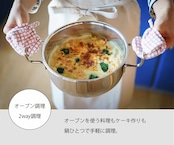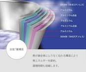 鍋製品の材質は、熱伝導性の高いアルミニウムをステンレスで挟んだ全面7層構造。鍋ごとオーブンで使用することもできるし、鍋そのものをオーブンのように使って、ケーキを作ることもできるほど高性能だ。ハンドルもステンレスなので「熱くなるのでは」と不安に感じる向きもあるかもしれないが、この部分が握れないほど熱ければ火力が強すぎる目安になるというから、よく考えられている。
