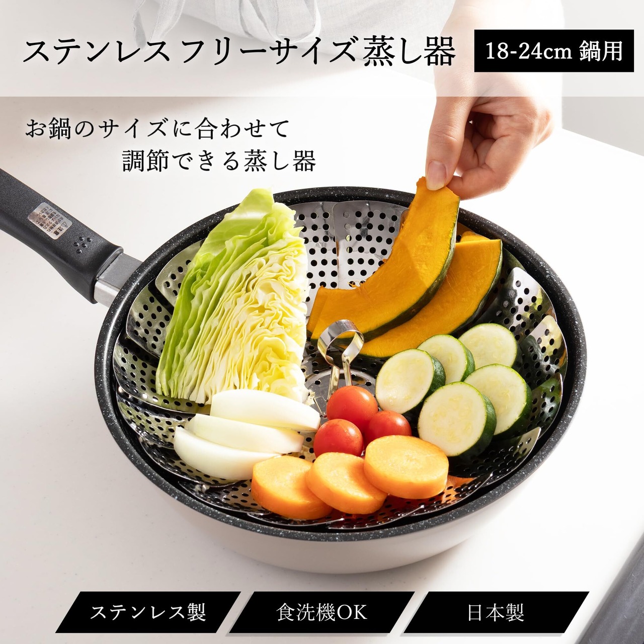 18〜24cmのお鍋のサイズに合わせて調節できる日本製の蒸し器です。