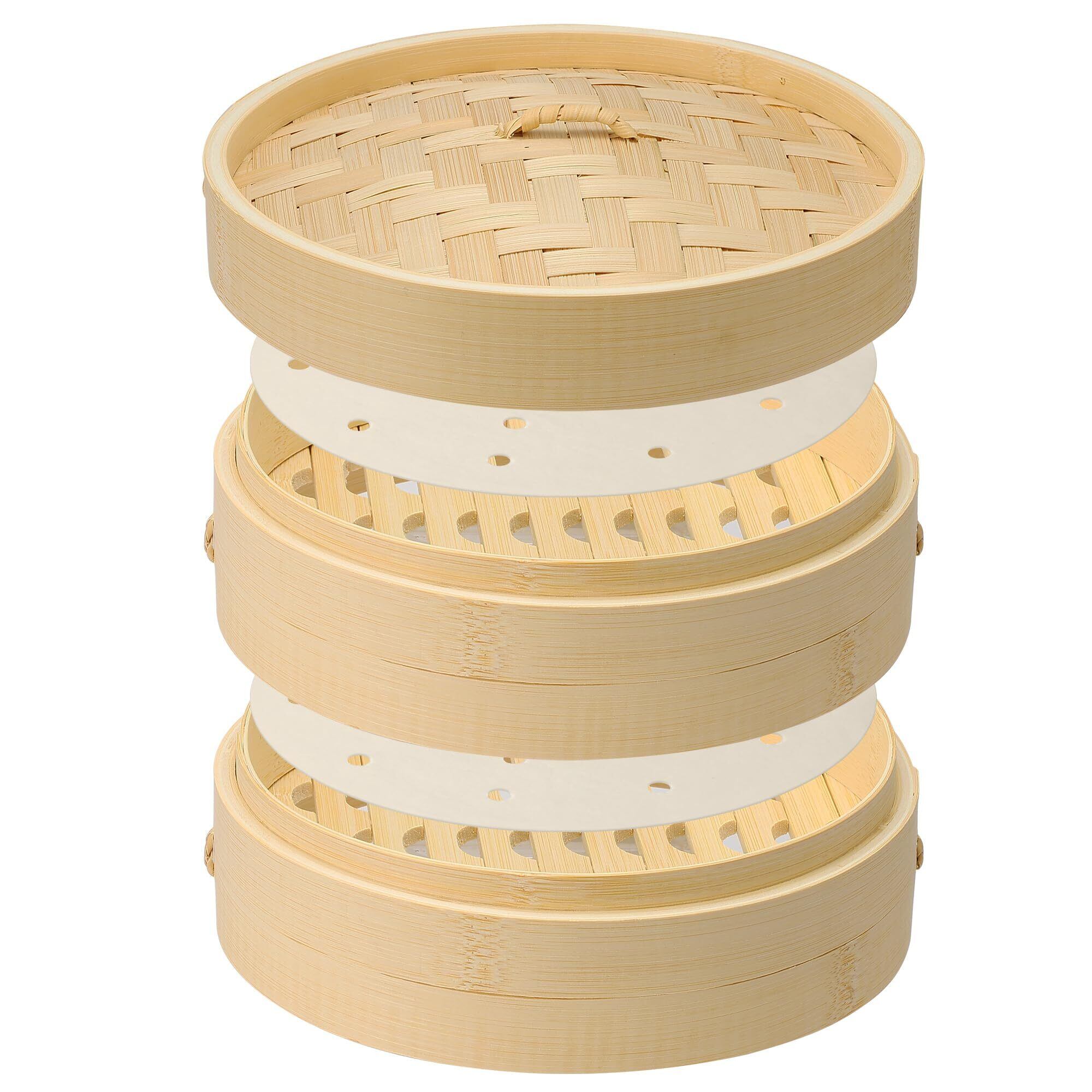 せいろ 蒸し器セット 21cm 本体 2 個と蓋 1 個 専用紙 50 枚付き 竹製の蒸籠 蒸篭 小籠包 蒸籠 蒸し野菜用 蒸し料理 竹製 手作り 竹製蒸籠 清蒸菜 中華式セイロ 蒸し料理用 調理器具 キッチン用品