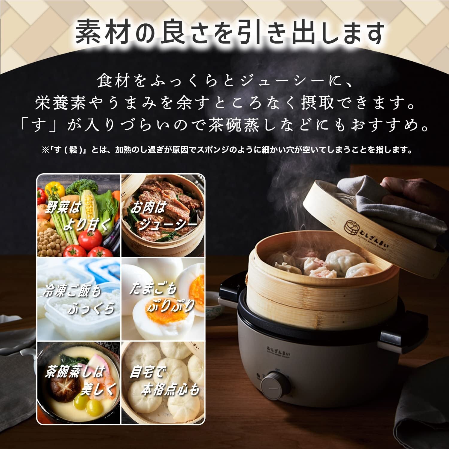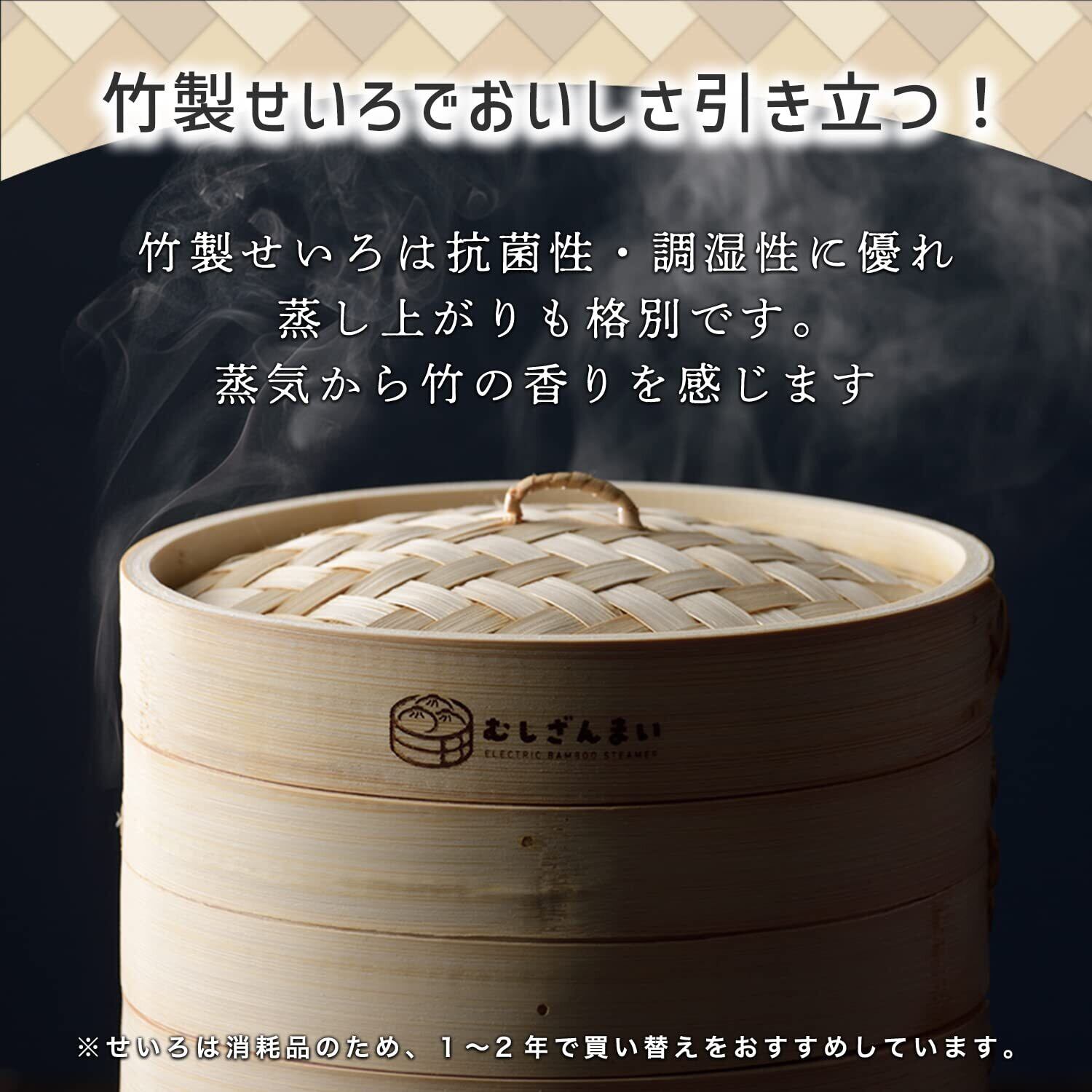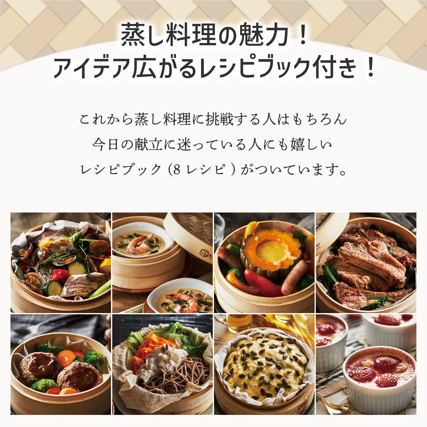 自然素材の力で、ヘルシーで格別な蒸し料理を楽しむ。竹製せいろの魅力をあなたの食卓に。竹製せいろは、抗菌性と調湿性に優れた自然素材を活かした調理器具です。そのため、衛生面でも安心してお使いいただけます。調湿性によって食材の蒸し上がりはふっくらと仕上がり、格別な美味しさを引き出します。さらに、蒸気とともに漂う竹の香りが、食材の風味をさらに引き立てます。蒸し野菜やシュウマイ、蒸し鶏など、さまざまな料理を竹の香りがほんのり包み込み、自然の恵みを感じることができます。素材の味を大切にしたい方やヘルシー志向の方に、最適な選択肢です。この竹製せいろで、毎日の食事に自然素材の力をプラスしてみませんか?伝統的な魅力と機能性を兼ね備えた電気せいろが、新たな料理体験をご提供します。