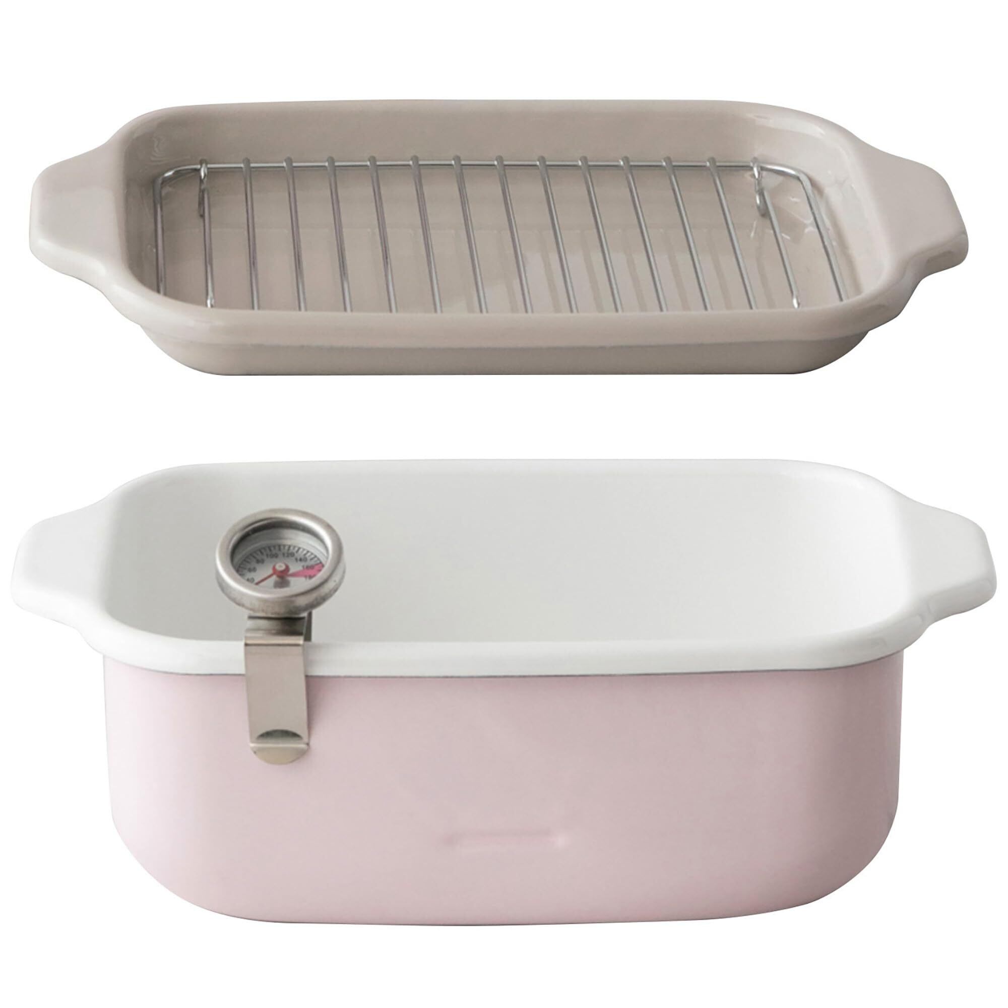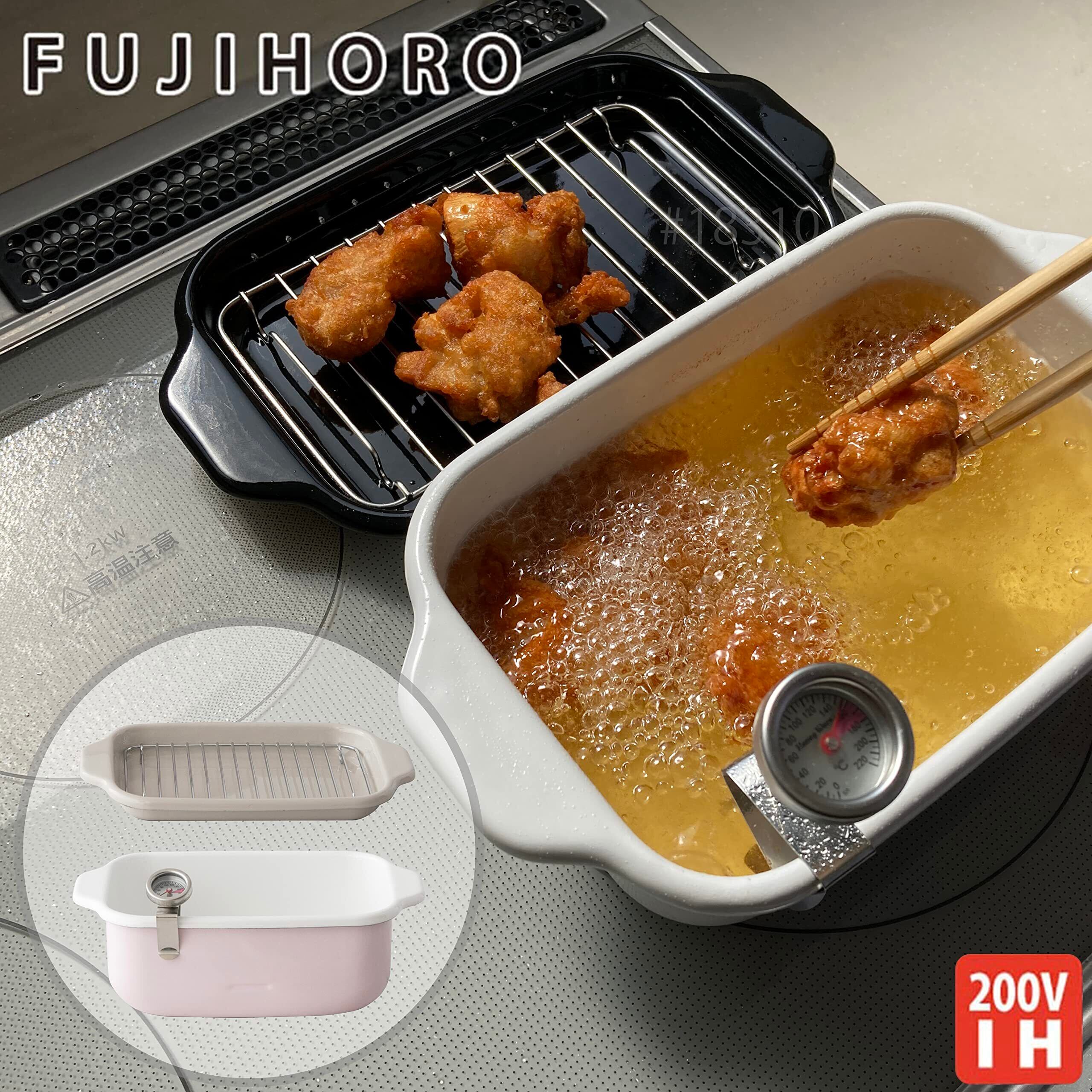 富士ホーロー 角型 天ぷら鍋 ピンク IH 対応 温度計 揚げ網 バット 付き ギフト
