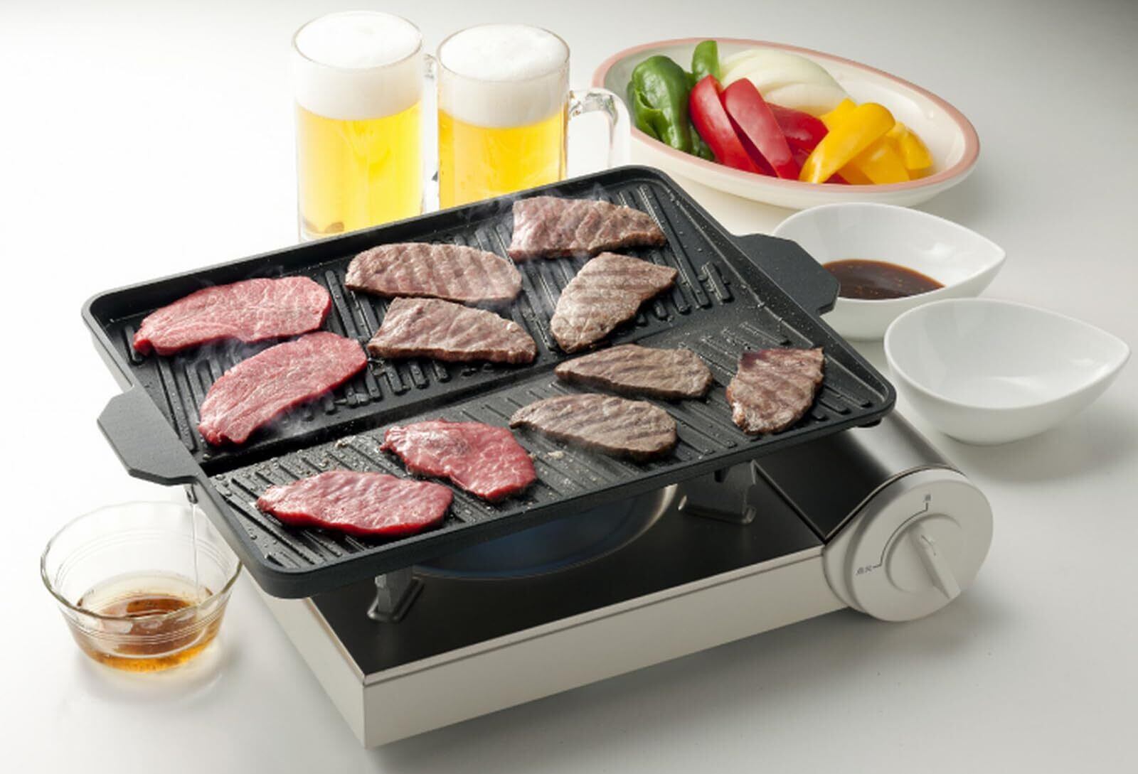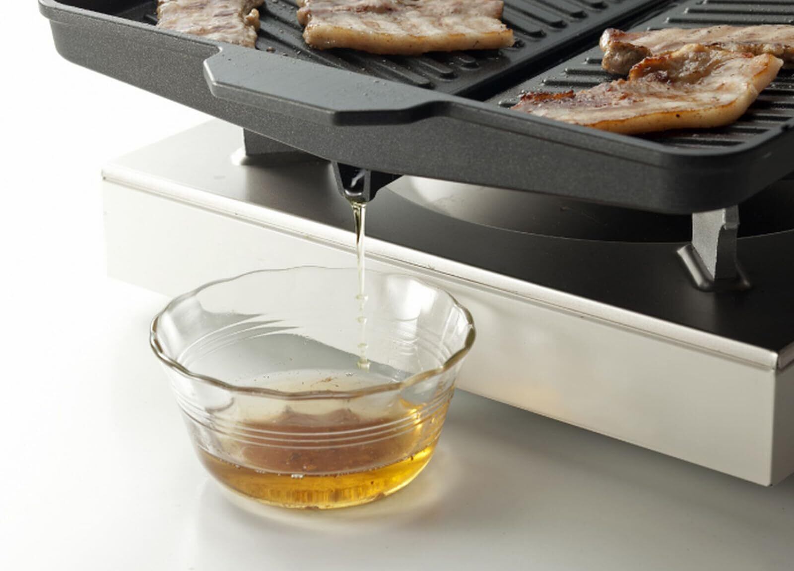 ●お肉の余分な油を落とす溝付プレート! (油を溜めないことで野菜を焼く時に油の飛び散りを抑えます)