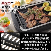 【吸煙機能】独自のXカット構造を採用したプレートで油落ちを促進し、さらに吸煙ファンを内蔵することで煙の拡散を抑え、調理中の煙を約94%カットし、油ハネも軽減します。室内でも煙と臭いを気にせず、気軽においしい焼肉が楽しめます。