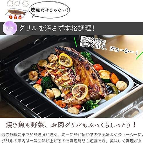 【グリルを汚さず本格料理!】焼き魚も野菜、お肉グリルもふっくらしっとり!遠赤外線効果で加熱速度が速く、均一に熱が伝わるので風味よくジューシーに。グリルの庫内には一気に熱が上がるので調理時間も短縮できます。