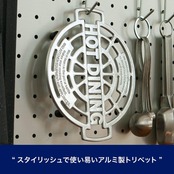 マンホールの蓋を思わせるデザインが、スタイリッシュなトリベット。アルミ製なので堅牢で軽く、使い込んで付いたキズも良い味わいとなるアイテムです。また、使わない時はプレートとして置くだけでも絵になる優れモノ。使い易いサイズと、滑り止めが付いた脚部も嬉しいポイントです。