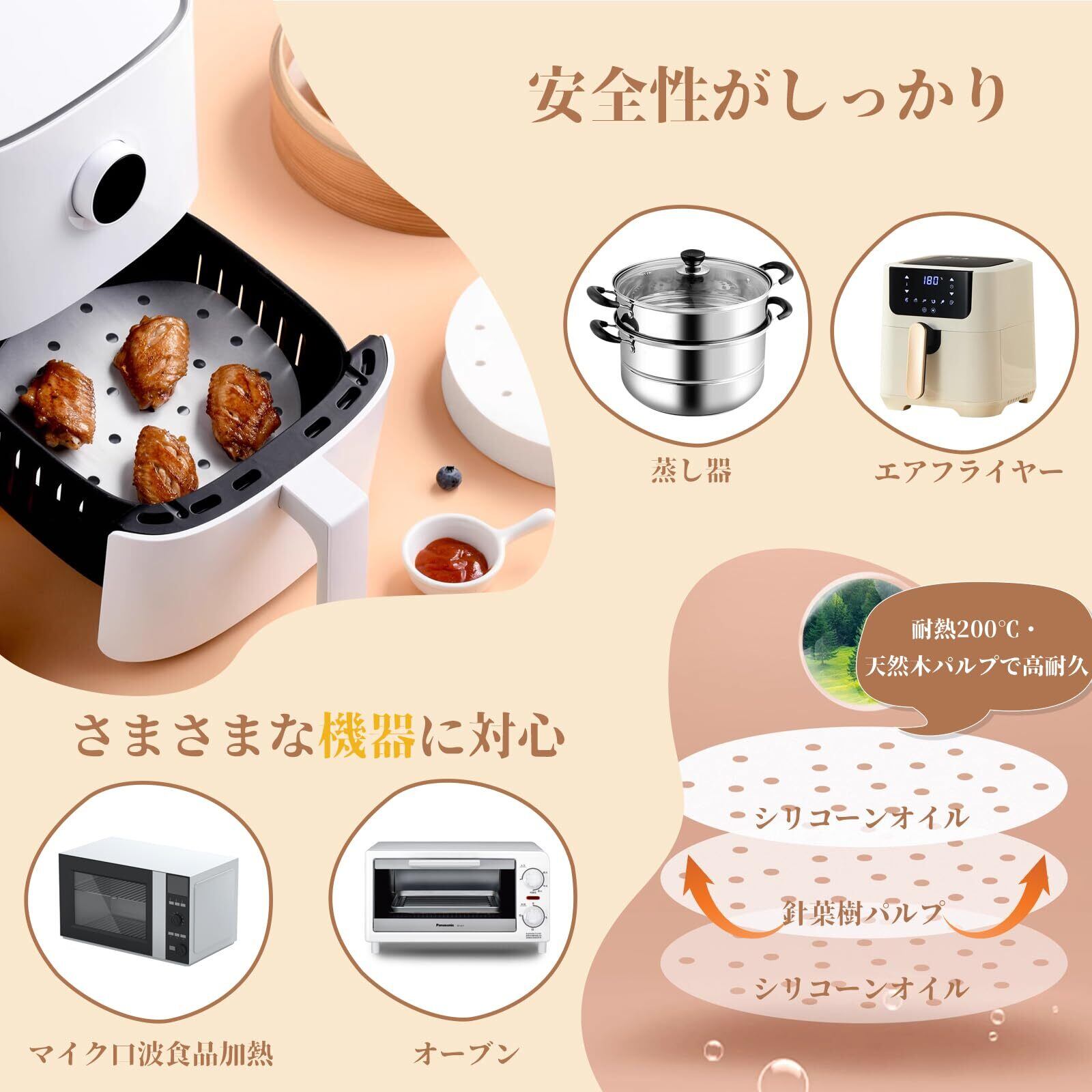 【安全性がしっかり】針葉樹パルプを原料とし、蛍光剤無添加製法で作られているため、母子にも安心です。両面食品用シリコーンオイル加工で耐熱200℃、蒸し料理やオーブン調理でも有害物質を放出しません。環境に優しい生分解性素材です。
