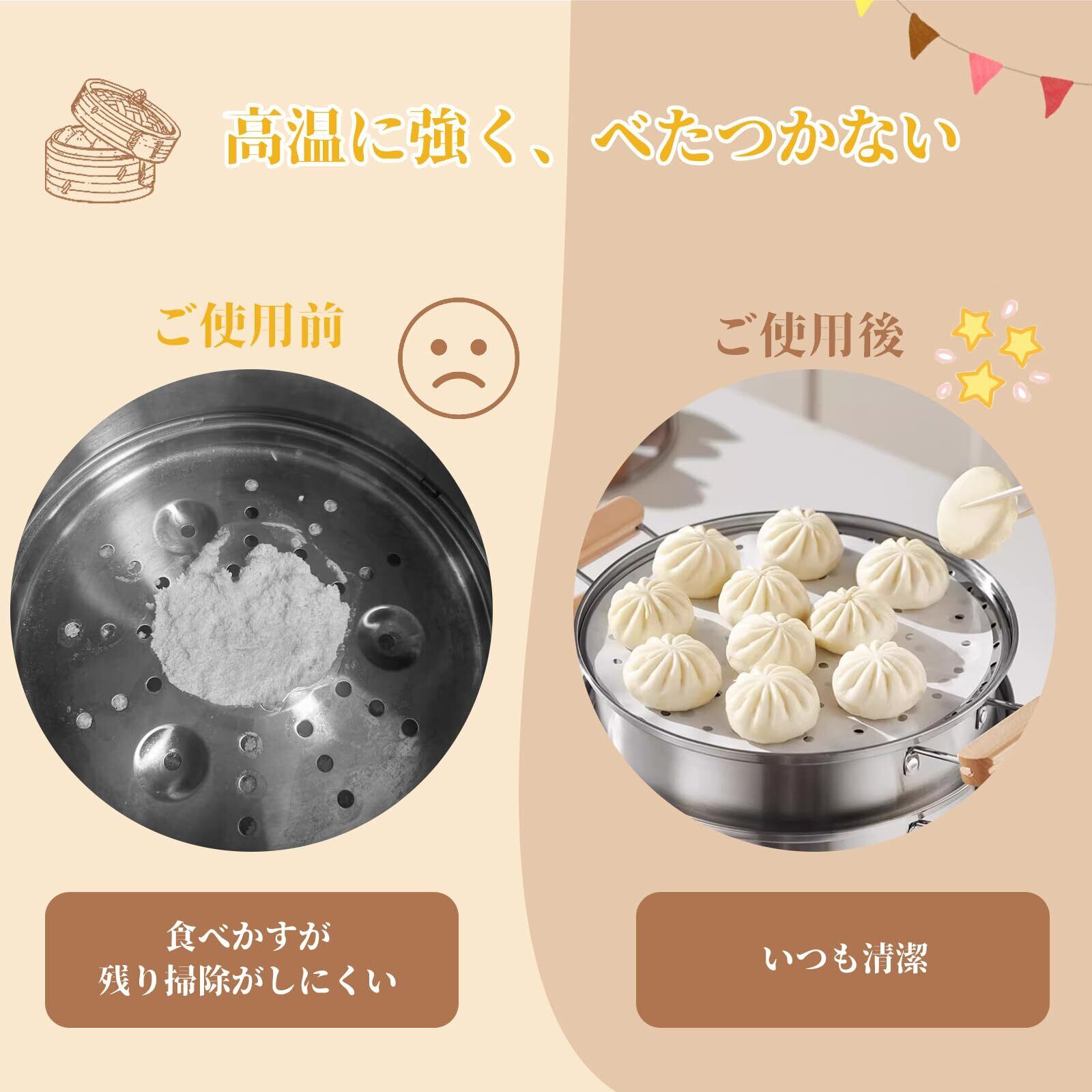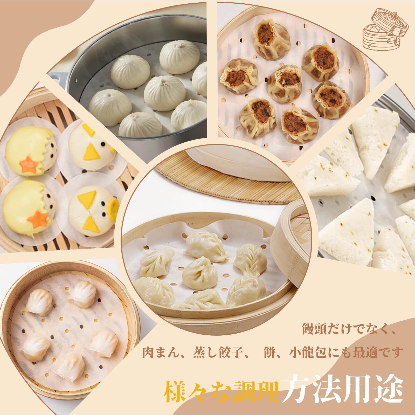 【1枚で調理シーンに対応】蒸し器必須:竹製蒸し器の洗浄難題を解決、肉まんやシュウマイがくっつきません。クロス調理可能:エアフライヤーやオーブン調理にも使える防焦げシートとして活躍。おもてなしに最適:餃子の皮や包子の仕切り用として、盛り付けも美しく衛生的です。