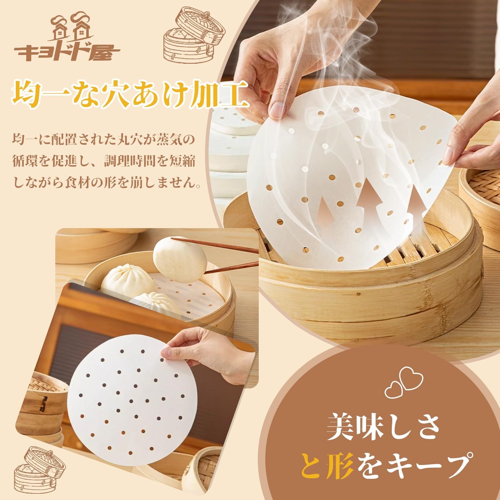 【美味しさと形をキープ】均一に配置された丸穴が蒸気の循環を促進し、調理時間を短縮しながら食材の形を崩しません。両面食品用シリコーンオイル加工でくっつきにくく、取り外しも簡単、お手入れもラクラク。直径16~24cmの複数サイズ展開で、さまざまな蒸し器や調理器具に対応します。