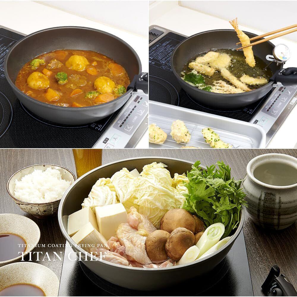 チタンシェフ脱着ハンドル式フライパンシリーズ専用の脱着ハンドル。誤操作防止の2段階ロック付きで調理中にハンドルからフライパンが外れるのを防ぎます。チタンシェフ脱着ハンドル式フライパンシリーズ以外のフライパンには使用できません。